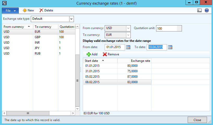 For this example, the following (fictional) currency exchange rates between the EUR and USD are used. (Please note that the local company currency is EUR).