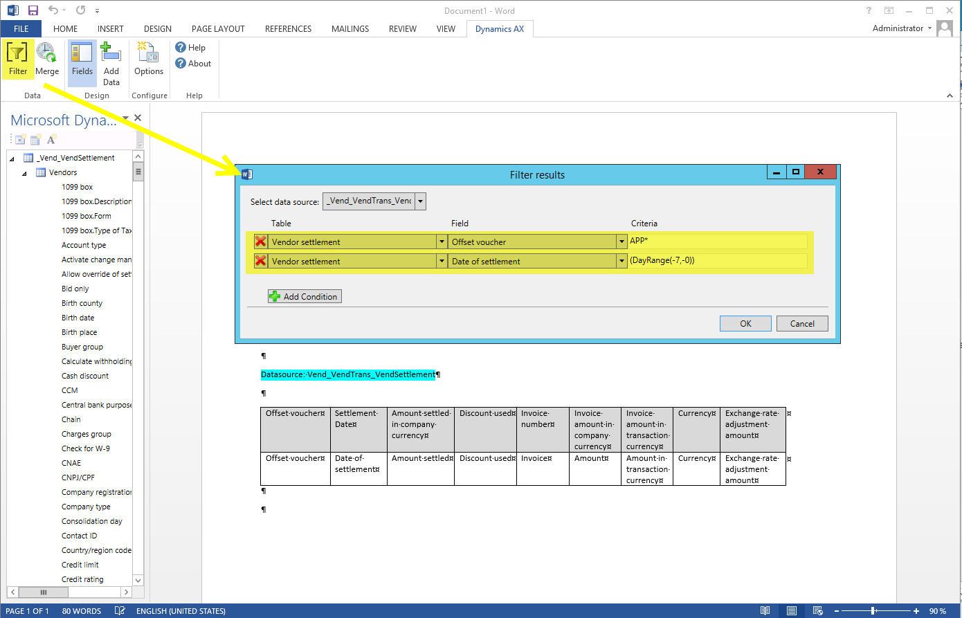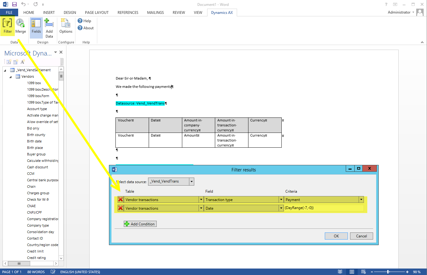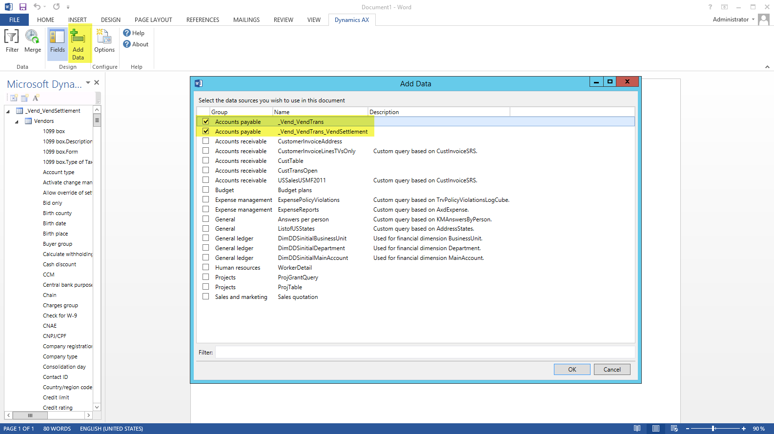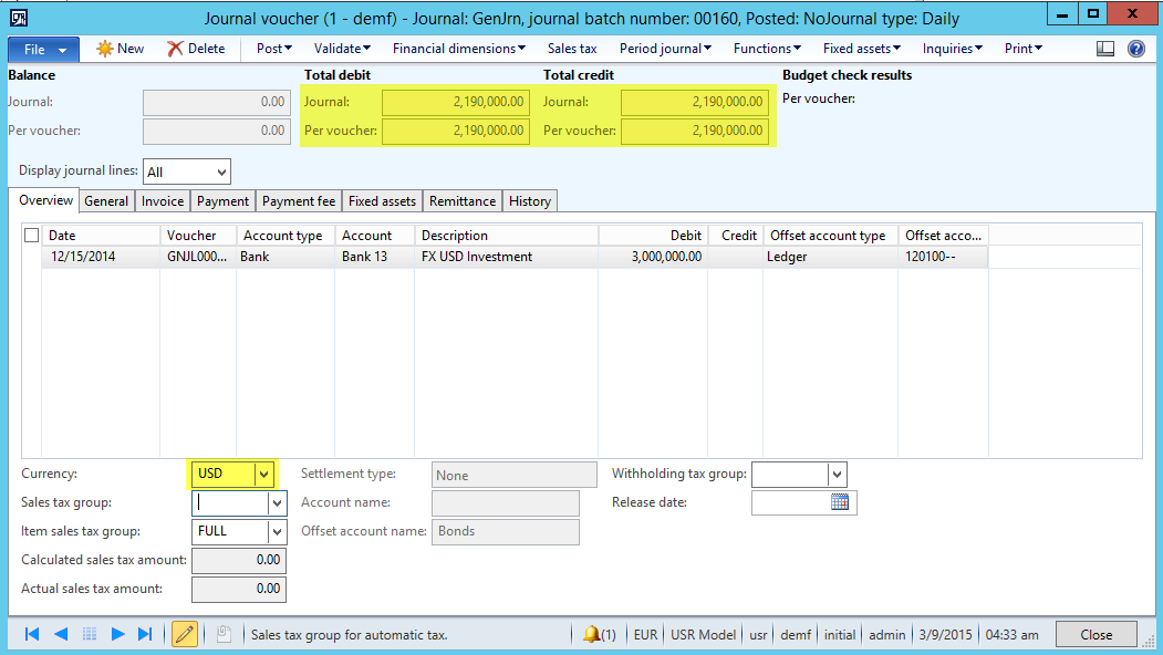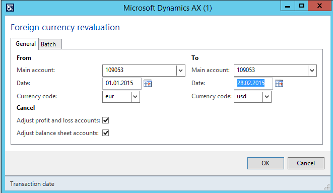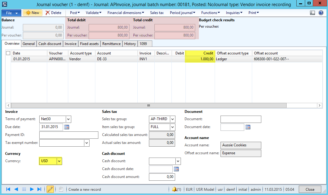 The first transaction recorded in Dynamics AX on 1 January 2015 is a vendor invoice for 1000 USD. At the time the vendor invoice is recorded the EUR/USD exchange rate stands at 80 EUR/100 USD, resulting in an amount equivalent to 800 EUR.