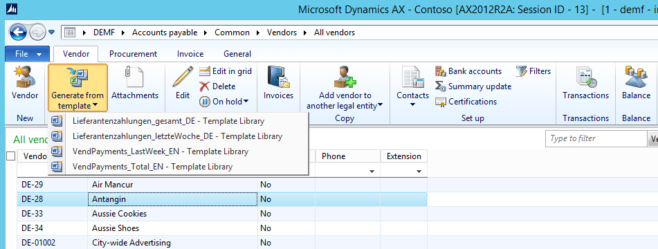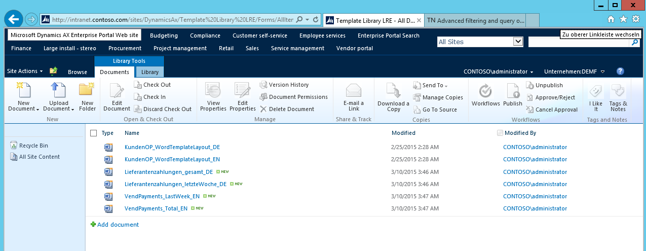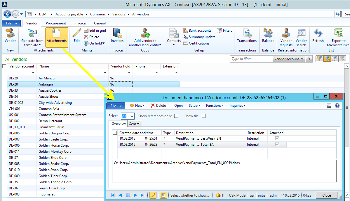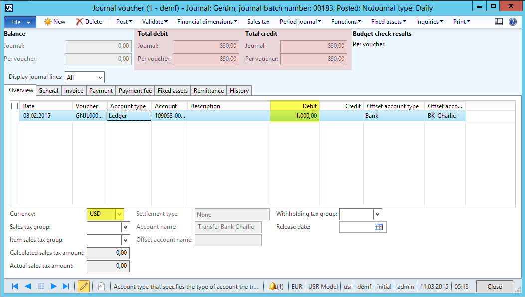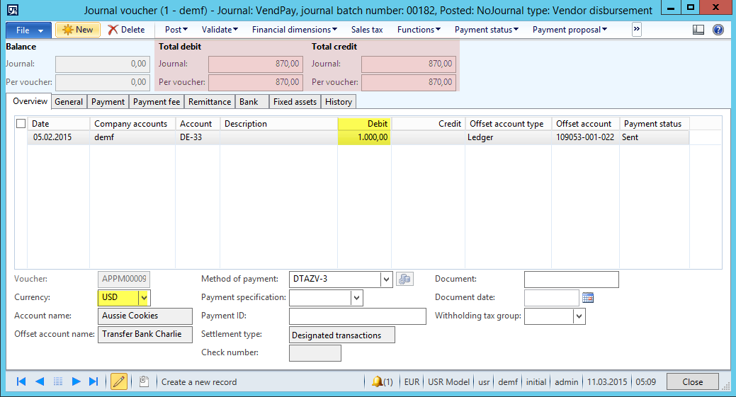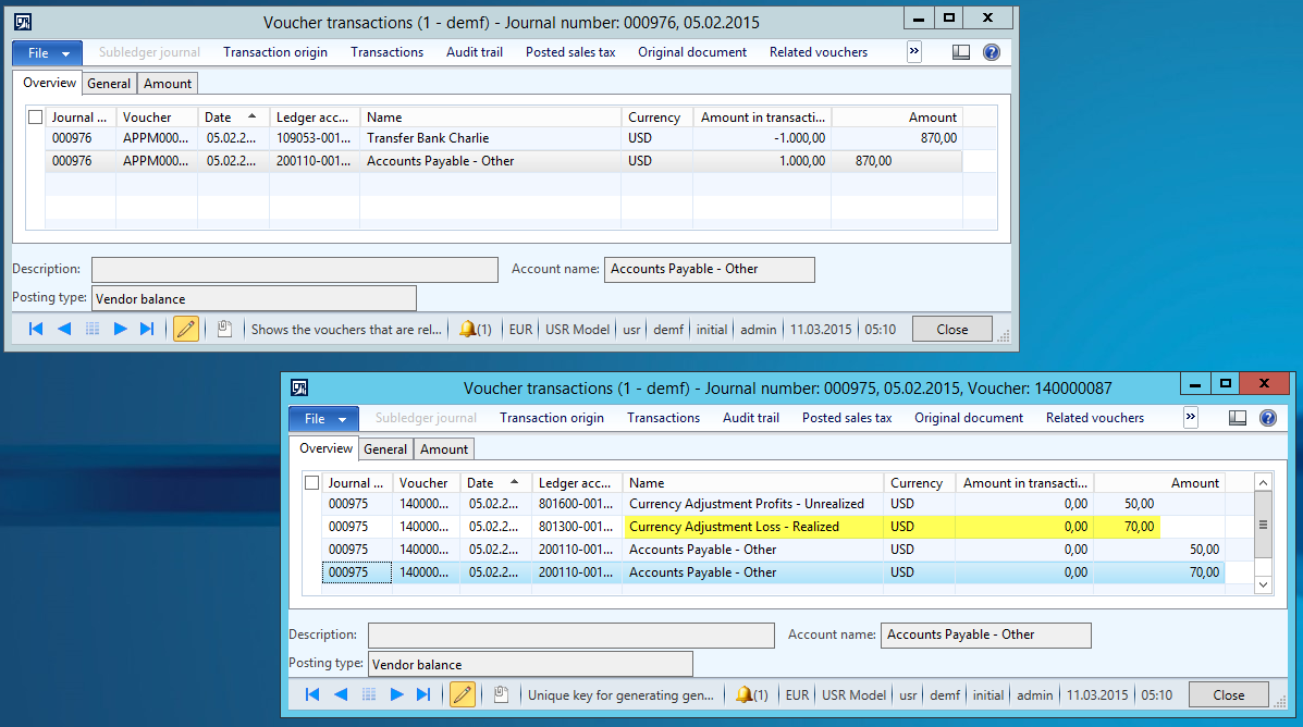 On 5 February 2015 the vendor invoice is paid by using a wire transfer. This transfer is – as usual – recorded in a vendor payment journal in the Accounts Payable module. Because the USD appreciated to 87 EUR/100 USD at the time the payment is made, an exchange rate loss of 70 EUR is realized. This loss is recorded on the ledger account for realized exchange rate losses. At the same time, Dynamics AX cancels the previously recorded unrealized exchange rate gain of 50 EUR. The next screens show the payment made and the corresponding vouchers created.