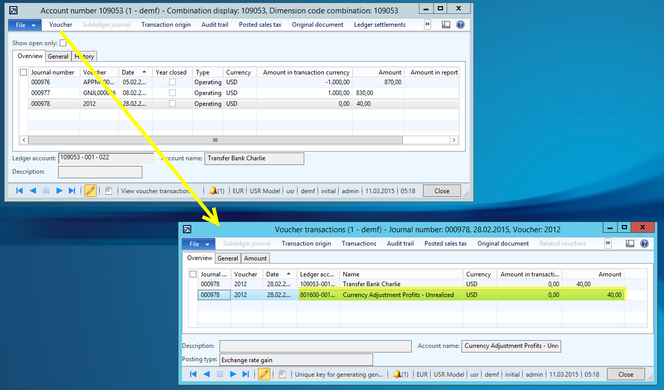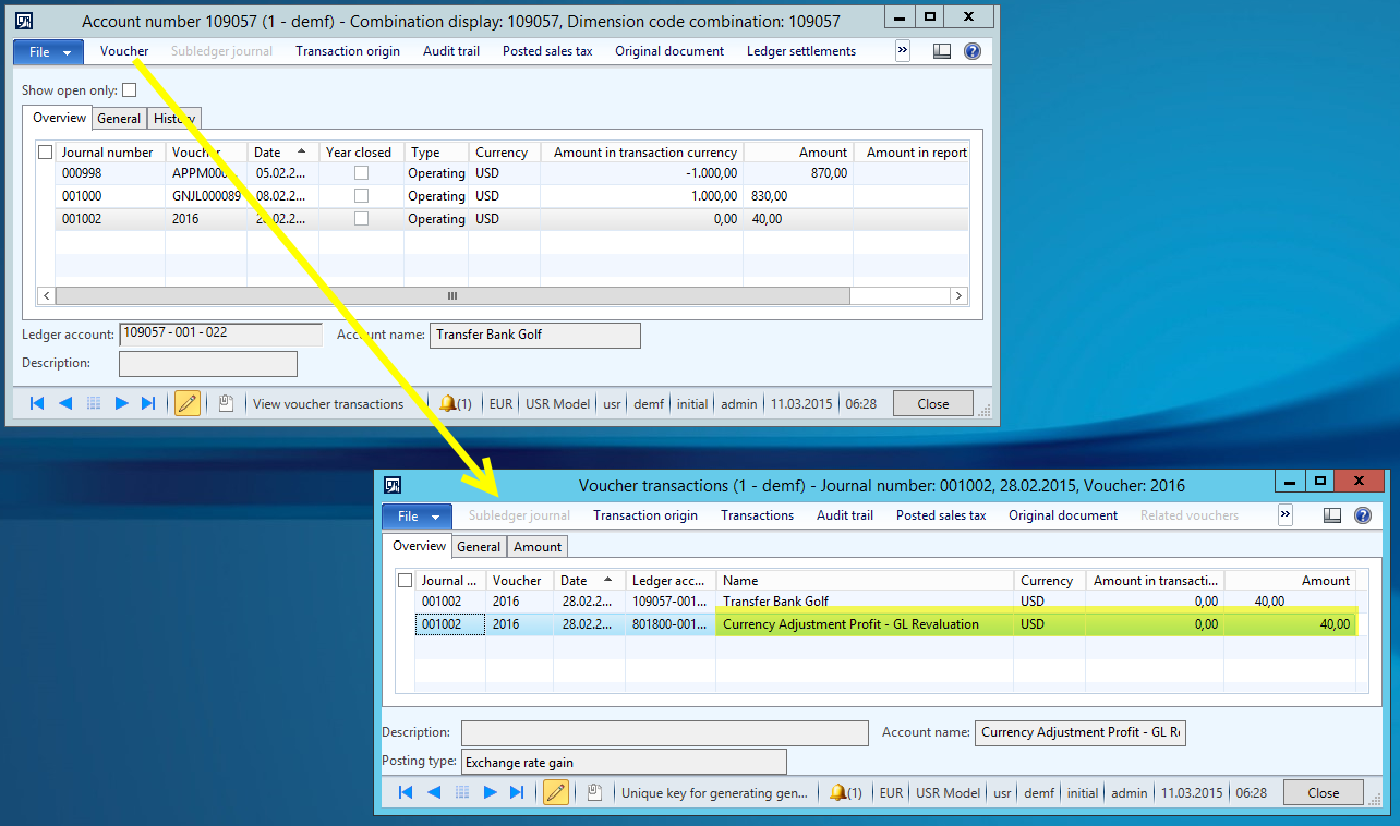 With this setup I repeat the previously recorded transactions on another (“fresh”) bank account and its corresponding transfer account. All steps and vouchers are identical except the voucher that is generated when running the foreign currency revaluation in GL for the transfer account.