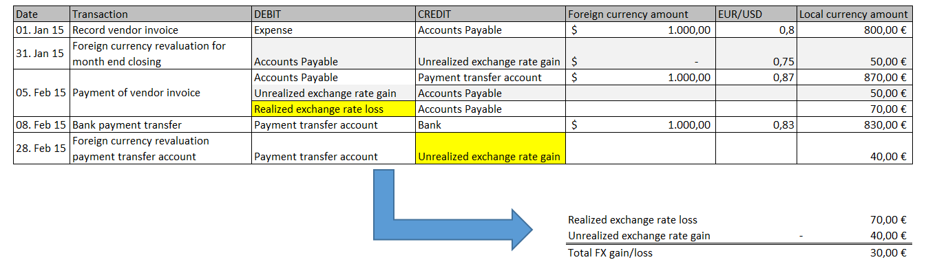 Even though the total exchange loss of 30 EUR is correct from an overall perspective, the elements that make up this total amount are wrong. That is, if your company reports realized and unrealized currency exchange gains/losses separately, your profit and loss statement shows incorrect figures.