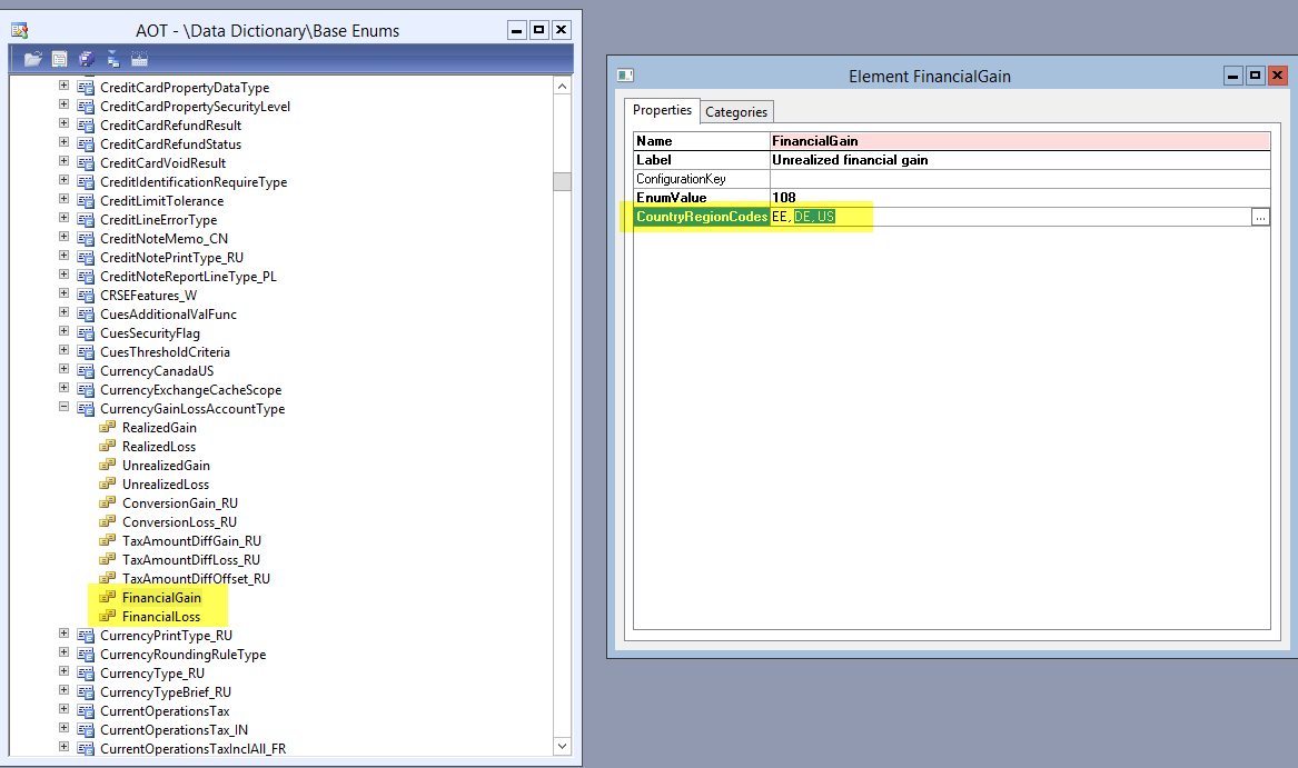 The first modification required is extending the Base Enum values “FinancialGain” and “FinancialLoss” of the “CurrencyGainLossAccountType” Base Enum. In my example I simply added the country codes for Germany (DE) and the USA (US). Please see the next screenshot for details.