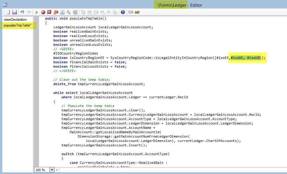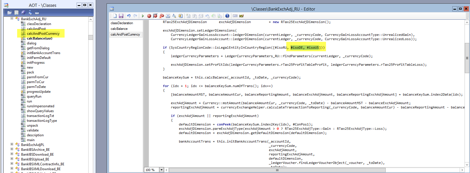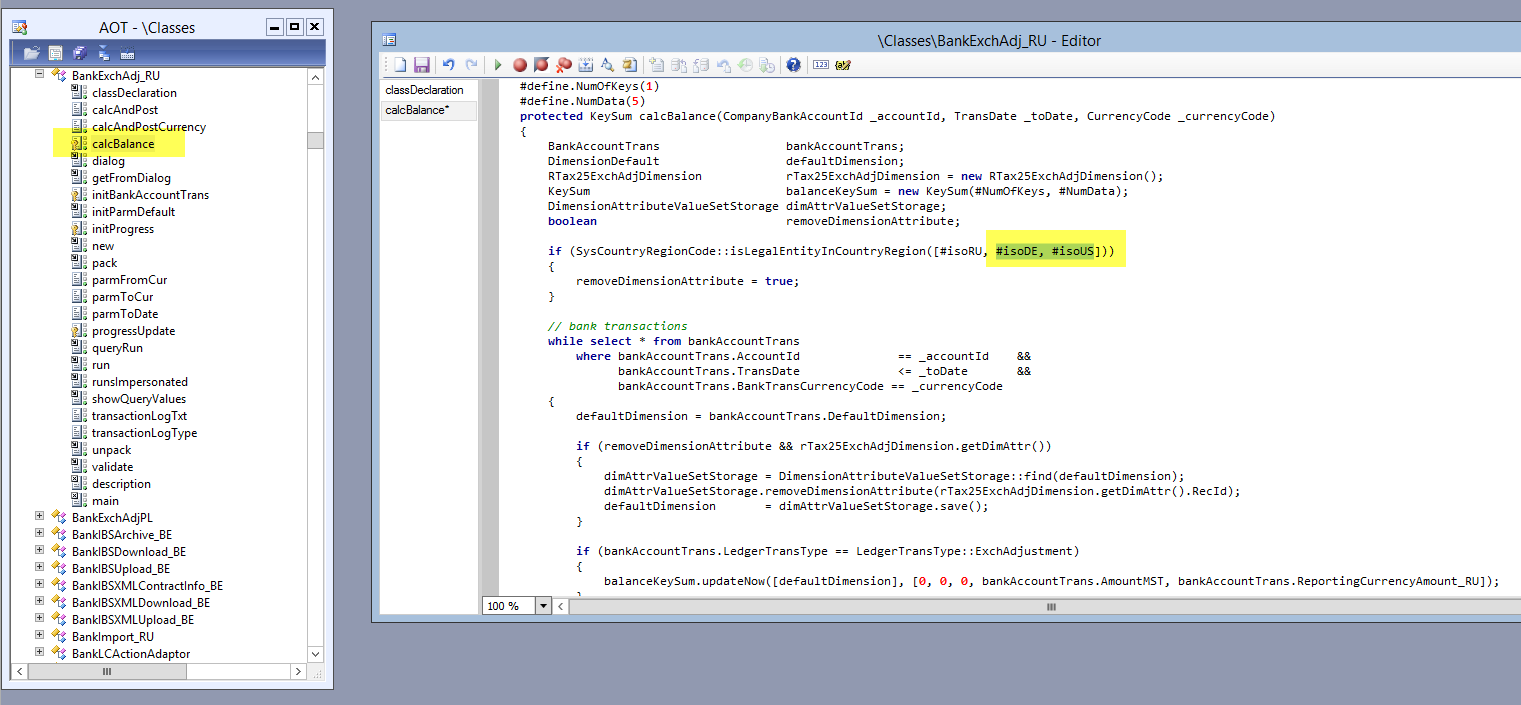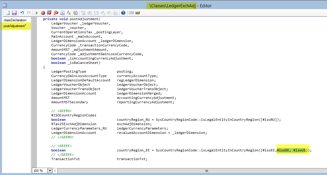 Step three requires extending the LedgerExchAdj class by the same country codes that have been used in step 1. Please note that those codes are entered slightly different (#isoDE, #isoUS).