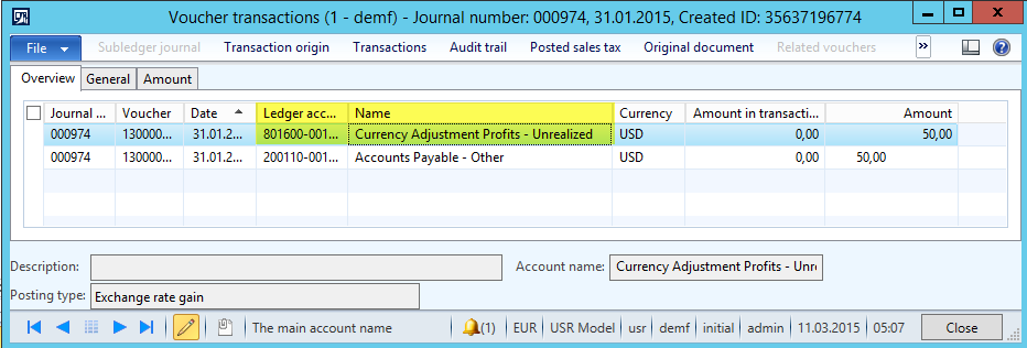 As the invoice is not settled until the end of January 2015, a foreign currency revaluation is run in the Accounts Payable module. This foreign currency revaluation process results in an unrealized exchange rate gain of 50 EUR (1000 USD * [80/100 EUR/USD – 75/100 EUR/USD]), which is recorded on the ledger account for unrealized exchange rate profits. The next screenshot shows the corresponding voucher.