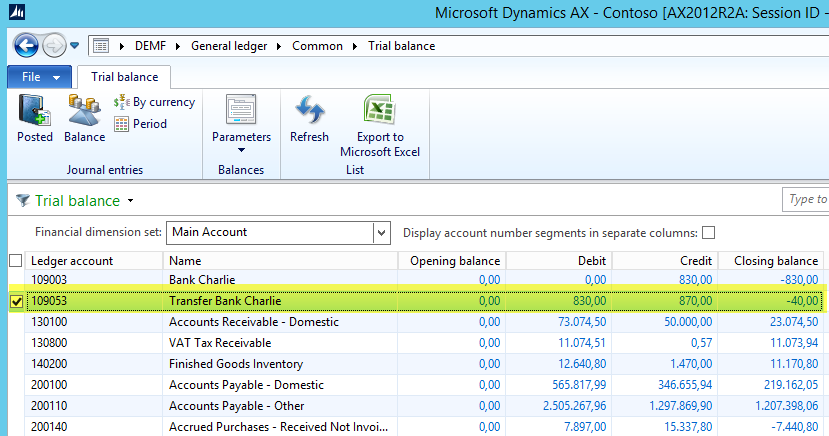 Please note that the payment is made via a transfer account – in my example account “109053 Transfer Bank Charlie”. This transfer account is cleared on 8 February when the bank transaction is posted (see the next screenshot).