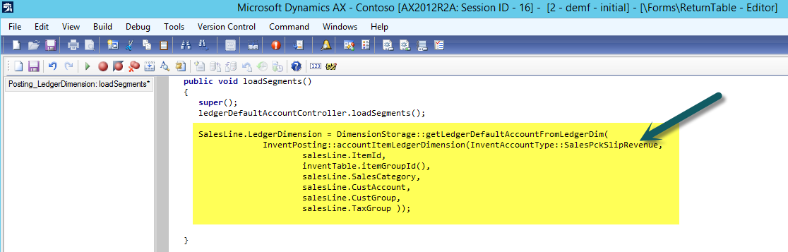 For the purpose of this example, I will continue with the invent account type “deferred revenue on delivery”. I made the following adjustment to the load segments method of the return table form to use the accounts setup in the “deferred revenue on delivery” section for return order sales transactions.