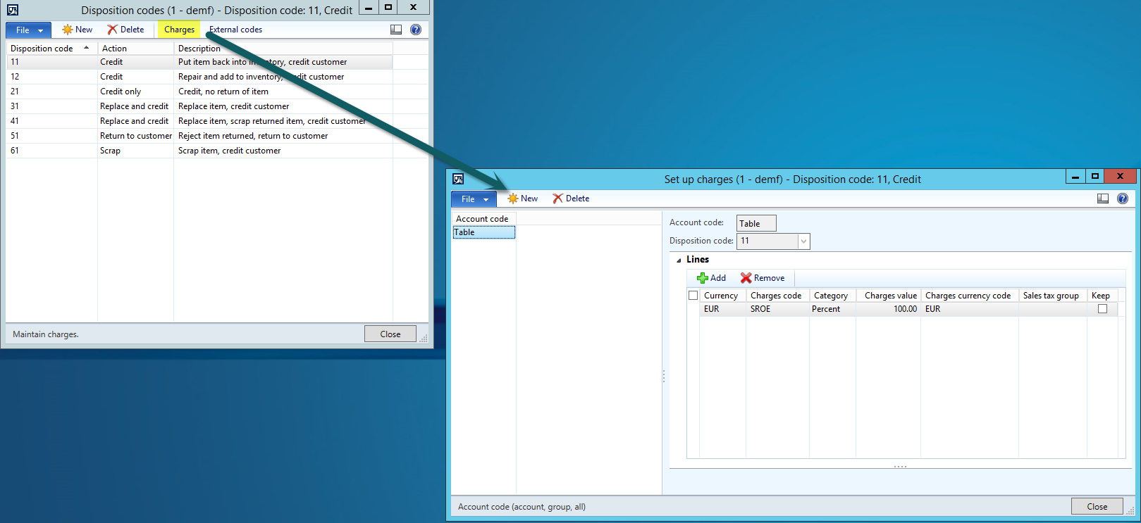 The way how this can be realized is by linking the different disposition codes – that are used when processing return orders – with automatic charge codes, as exemplified in the next screenshot.