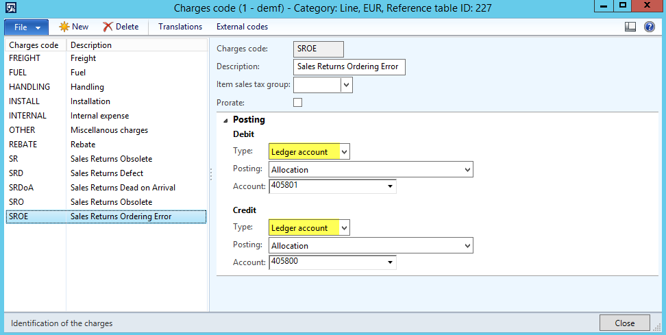Each of those charge codes is setup with a debit and credit posting type “ledger”, which simply serves the purpose of creating an additional posting line that allows identifying return order sales.