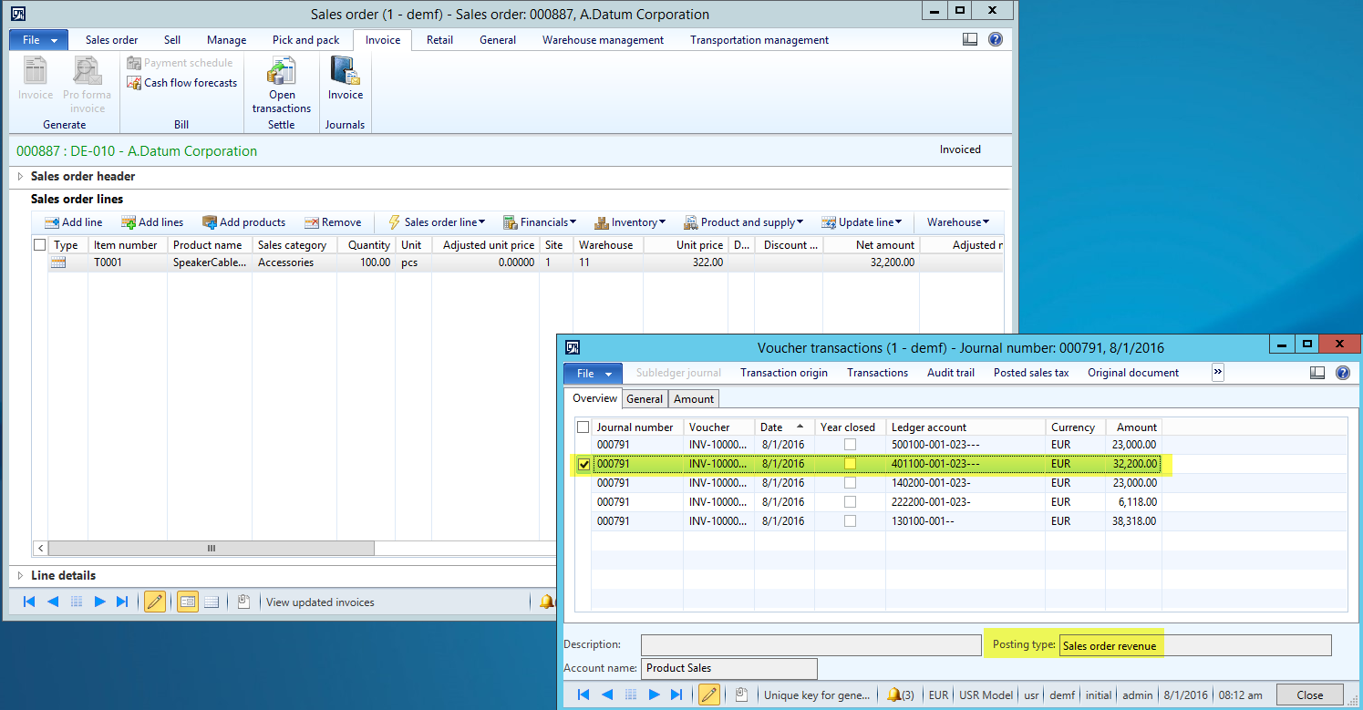 On 1st August a sales order invoice for 100 pcs of an item for a price of 322.00 / item is recorded in Dynamics AX and generated a voucher that posts the sales revenue on main account 401100. Please see the following screenshot.