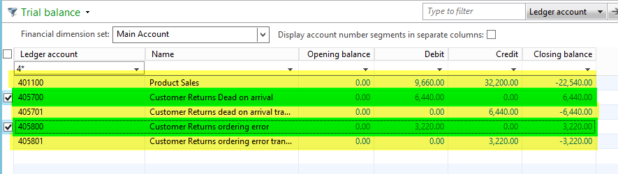 - As different charge codes have been setup for each disposition code, customer returns for “dead on arrival”, “ordering errors” and other reasons can easily be differentiated directly in the General Ledger by referring to the main accounts (405700 and 405800 in my example).