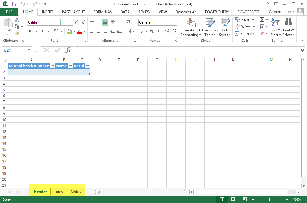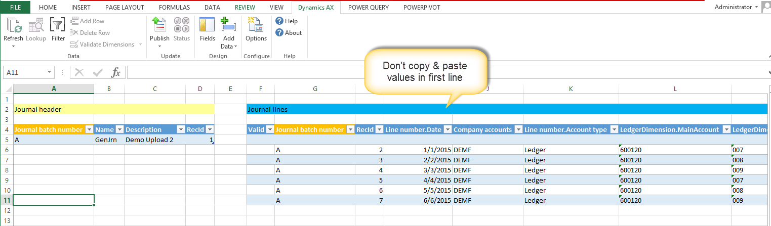 After generating a full CIL, refreshing the AIF services and deactivating and re-activating the LedgerService in the System administration module, create a new Excel template and add the fixed asset and project related transactions that you want to upload to AX.