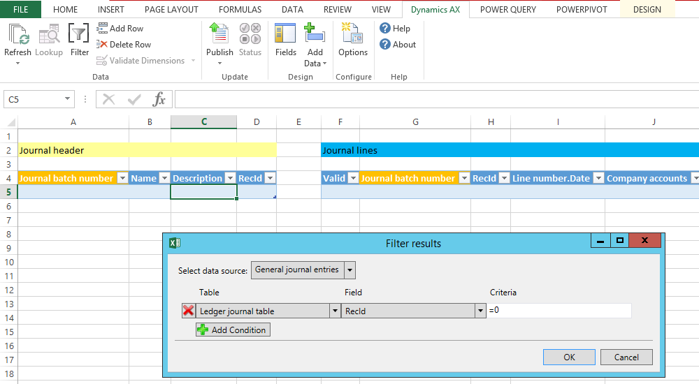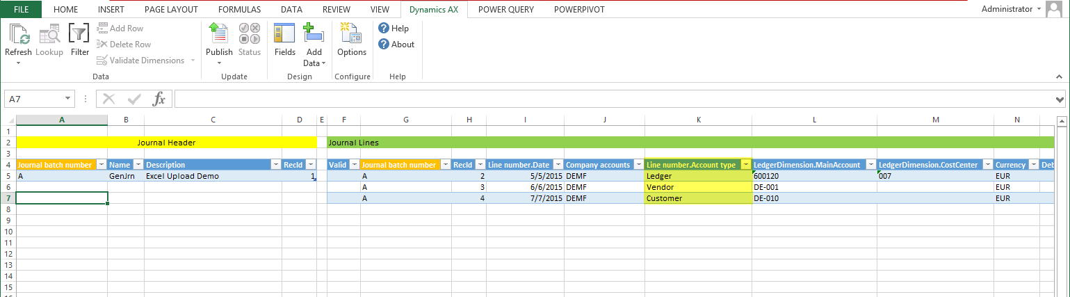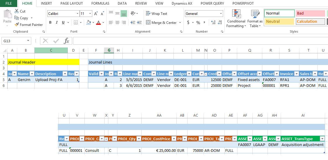 Within this blog post I will show you how the standard Excel add-in for uploading General Ledger transactions can be used for uploading project and fixed asset related transactions. Different from the uploads that I showed you in the previous blog post, the upload of project and fixed asset related transactions requires that the the LedgerJournalTrans table and the related LedgerJournalTrans_Asset / LedgerJournalTrans_Project tables are filled with the data prepared in the Excel template.