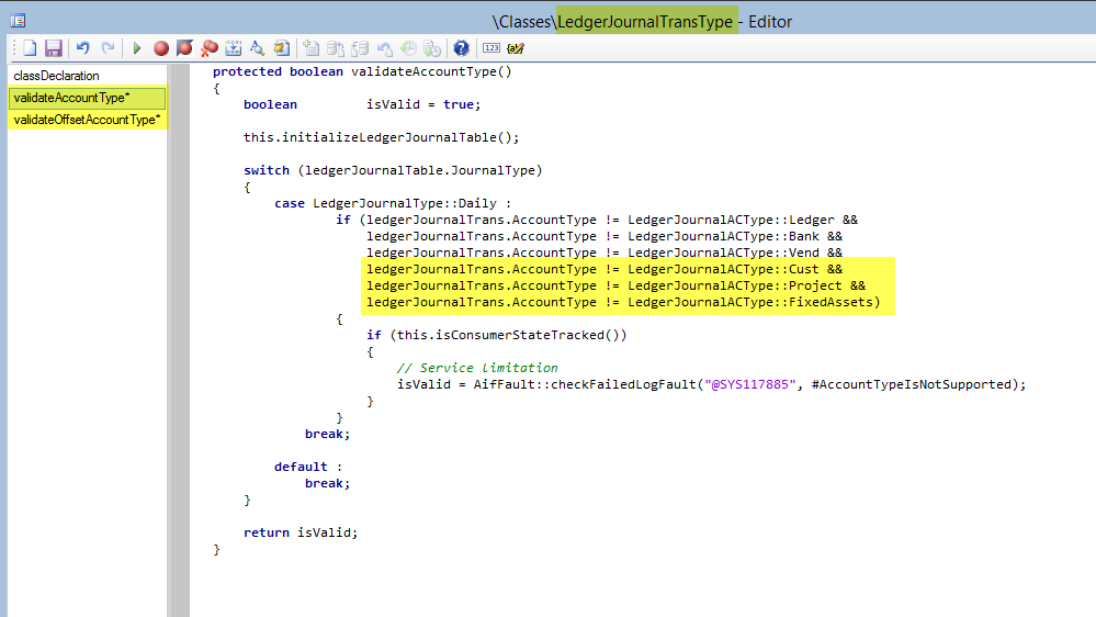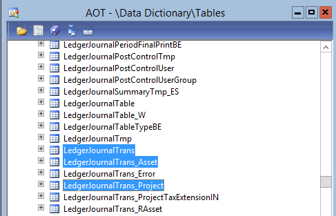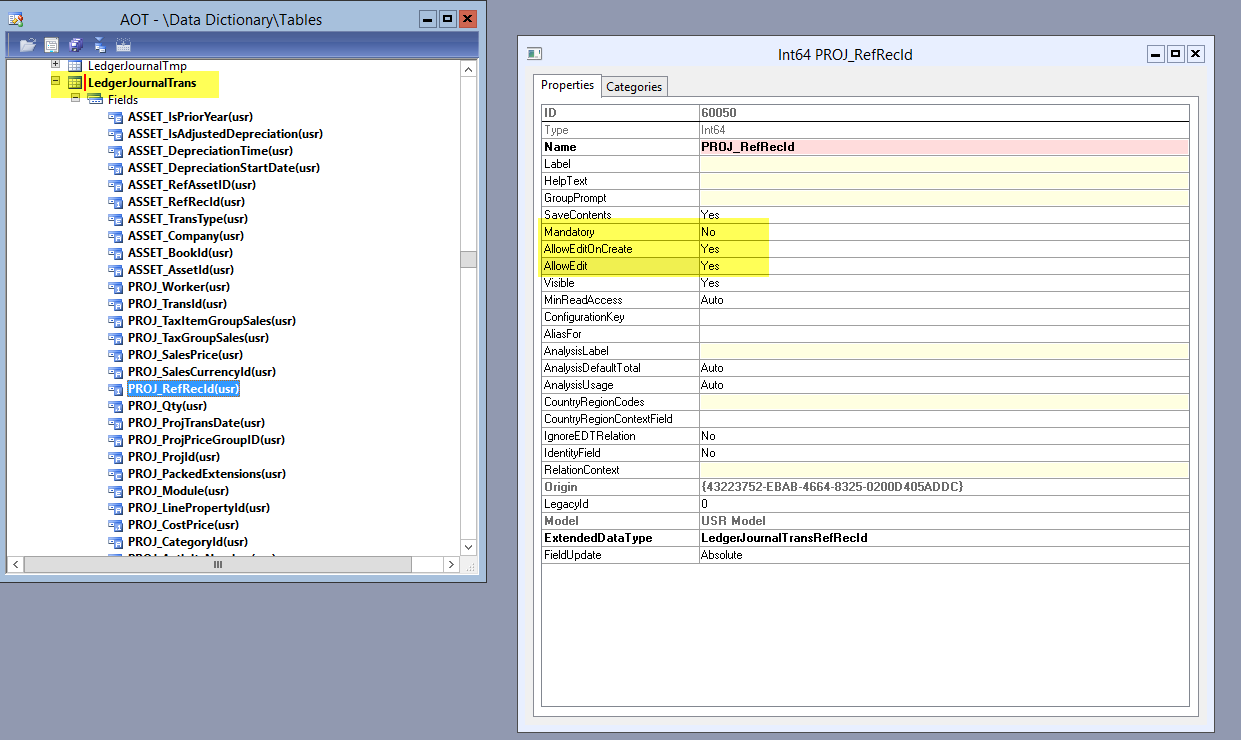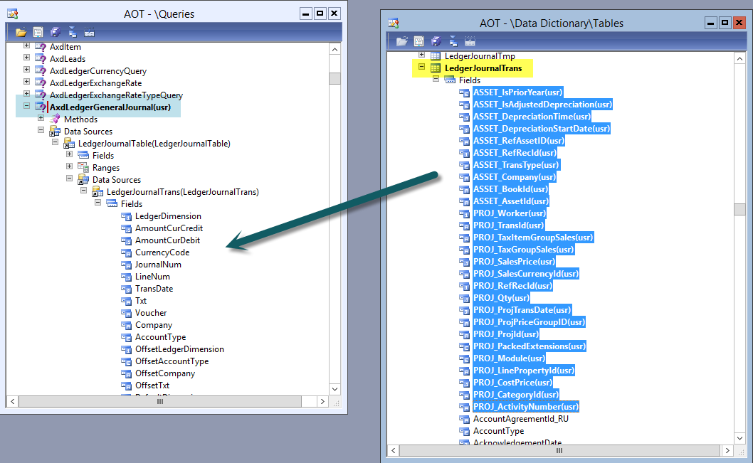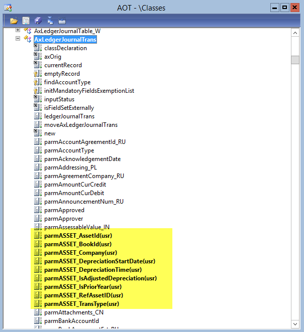 As a result, the AxLedgerJournalTrans class gets extended by the fixed asset and project parameter fields. Example: