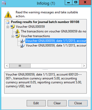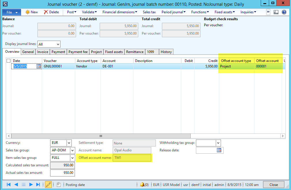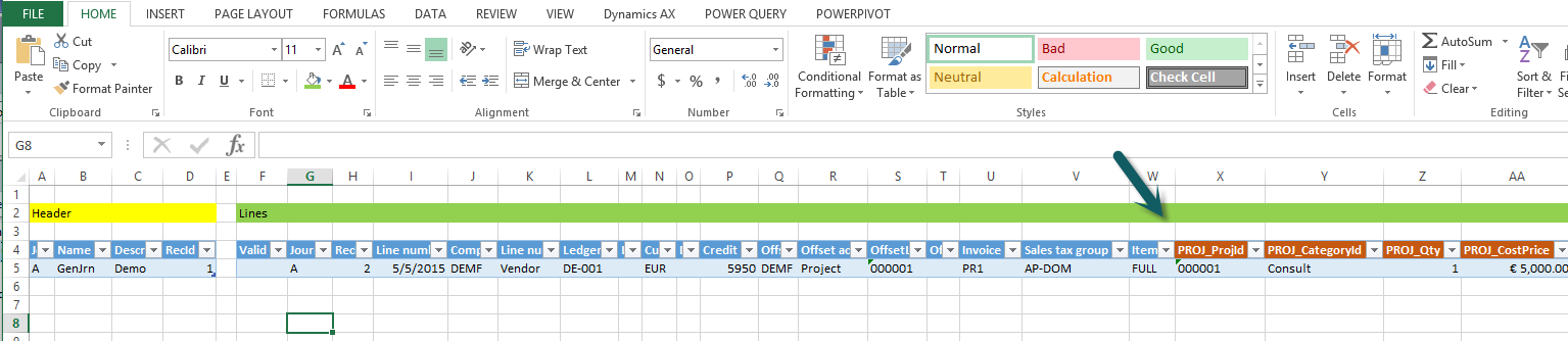 As usual and illustrated in the previous blog post, I setup my template with the new fields and added a project transaction that I uploaded to Dynamics AX.