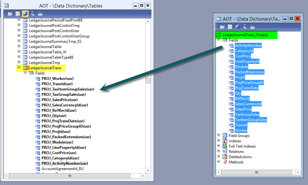 To realize that, I first added all fields that I need from the LedgerJournalTrans_Project table to the LedgerJournalTrans table.
