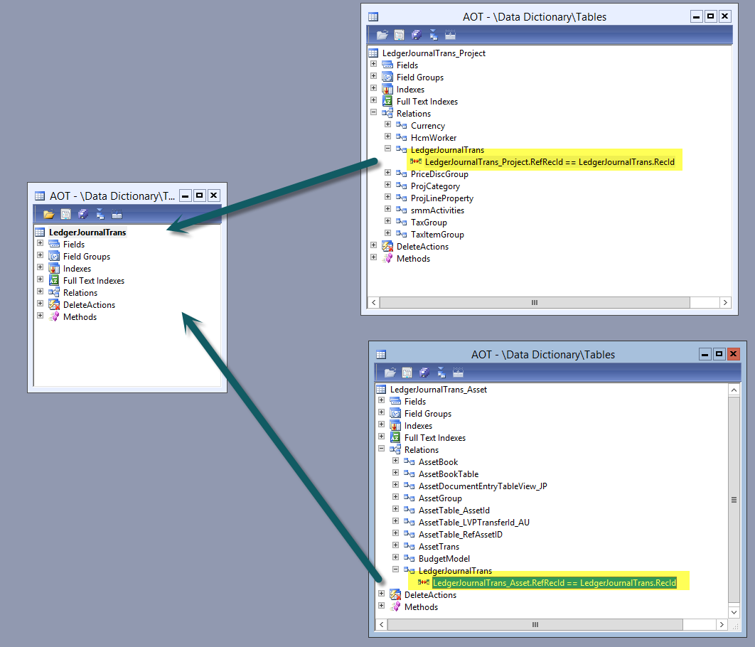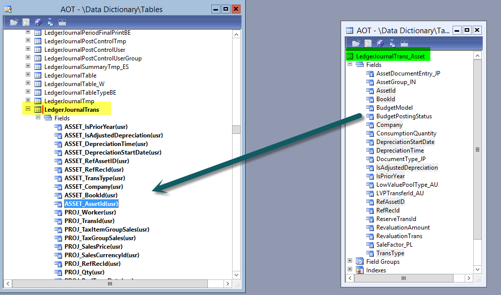 Map the newly added fields included in the LedgerJournalTrans table with the ones in the LedgerJournalTrans_Asset and LedgerJournalTrans_Project table as illustrated in the next screenshots.