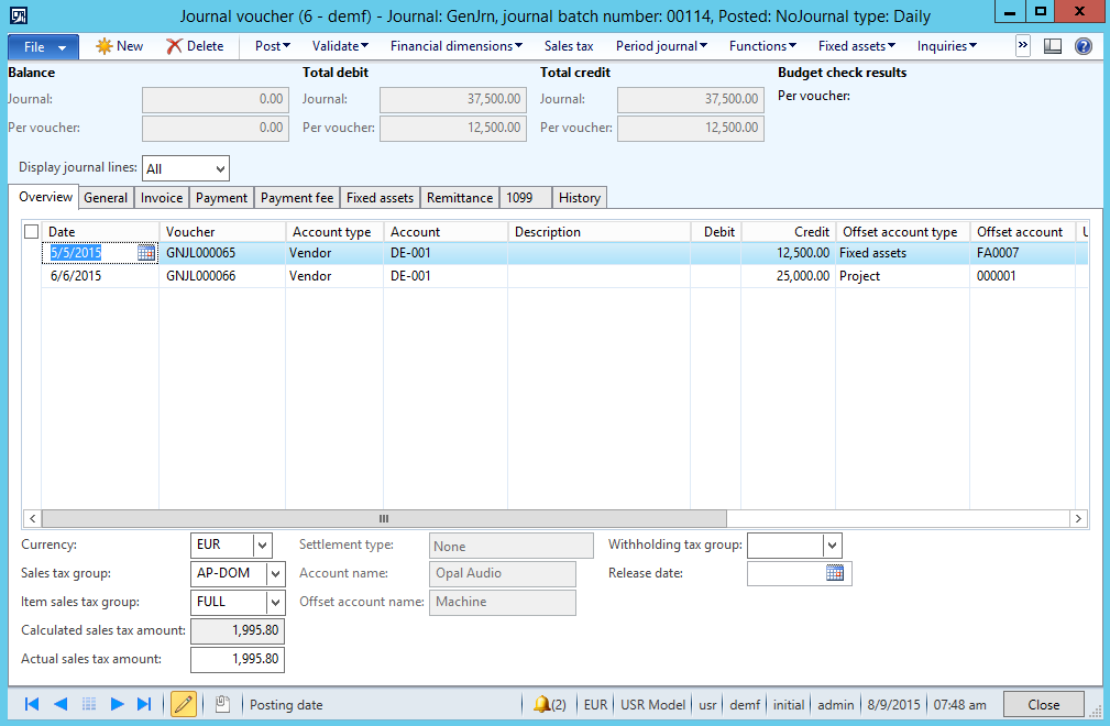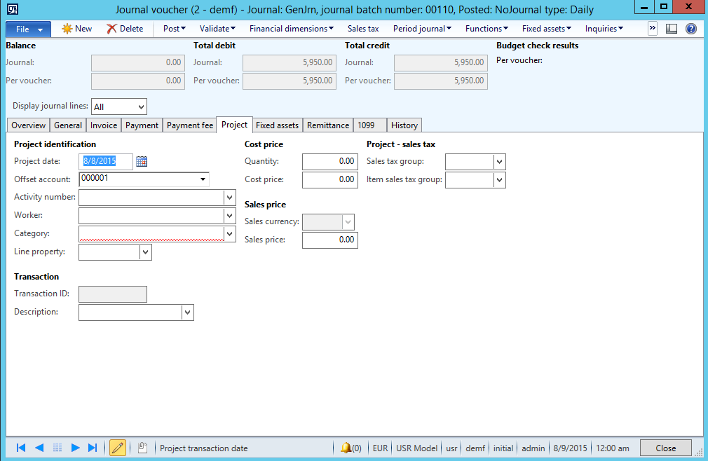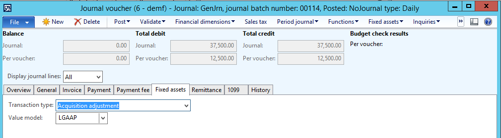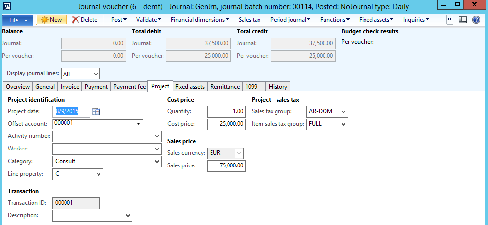 In the example illustrated in the next screenshot, I added one line with a fixed asset transaction and another line with a project transaction.