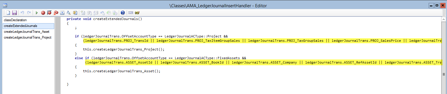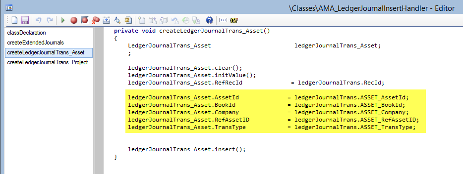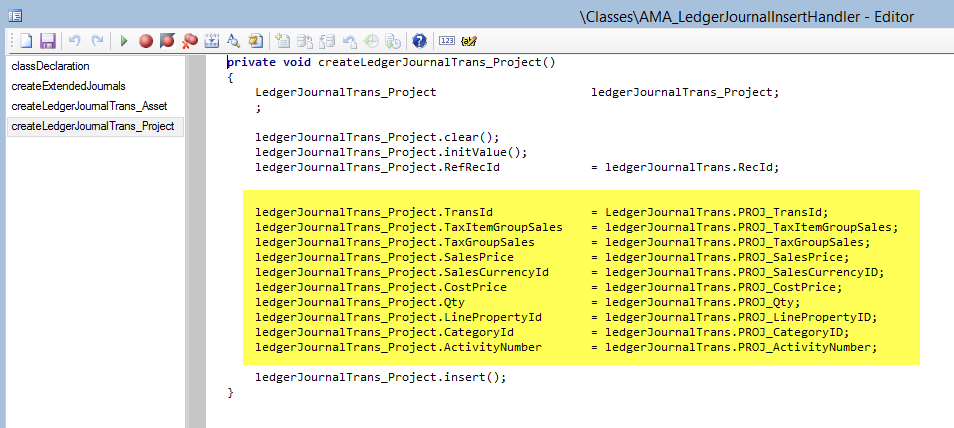 In the createExtendedJournals method, enter the fixed asset and project related fields that have been added to the ledgerJournalTrans table as illustrated in the following screenshot.