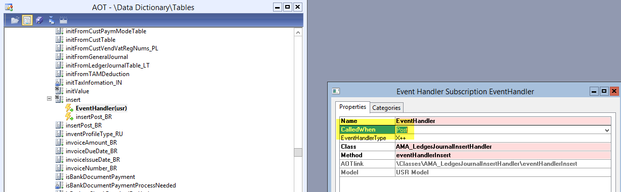 After the event handler has been added to the ledgerJournalTrans table, change the CalledWhen property from „PRE“ to „POST” as shown in the next screen-print.