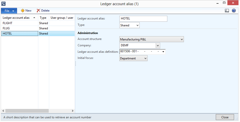 In the example illustrated in the following screen-prints, Dynamics AX replaces my shortcut “hotel” by the main account “601506” and business unit “001”. As I could not predefine the department in my ledger account alias, I still need to enter it manually in the journal.