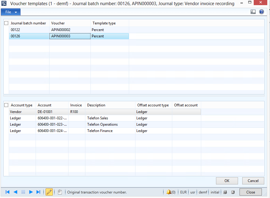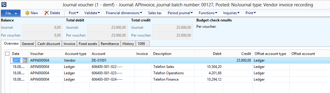 A final option that I want to introduce here is the use of voucher templates. Voucher templates can be setup in General Ledger or the Accounts Payable module and allow reusing a previously saved vouchers. The next screenshots show you a simplified example where a voucher is first saved as a template …