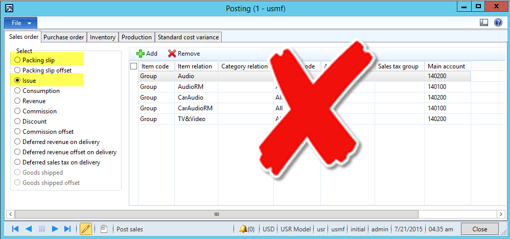 Please also try to avoid setting up the same ledger accounts for different inventory posting types. As an example, if you compare the inventory posting setup for sales order issue transactions in the next screenshot with the posting setup for packing slip transactions in the previous screenshot you can identify the same ledger accounts. This is something that should possibly avoided to make inventory reconciliation less complex.