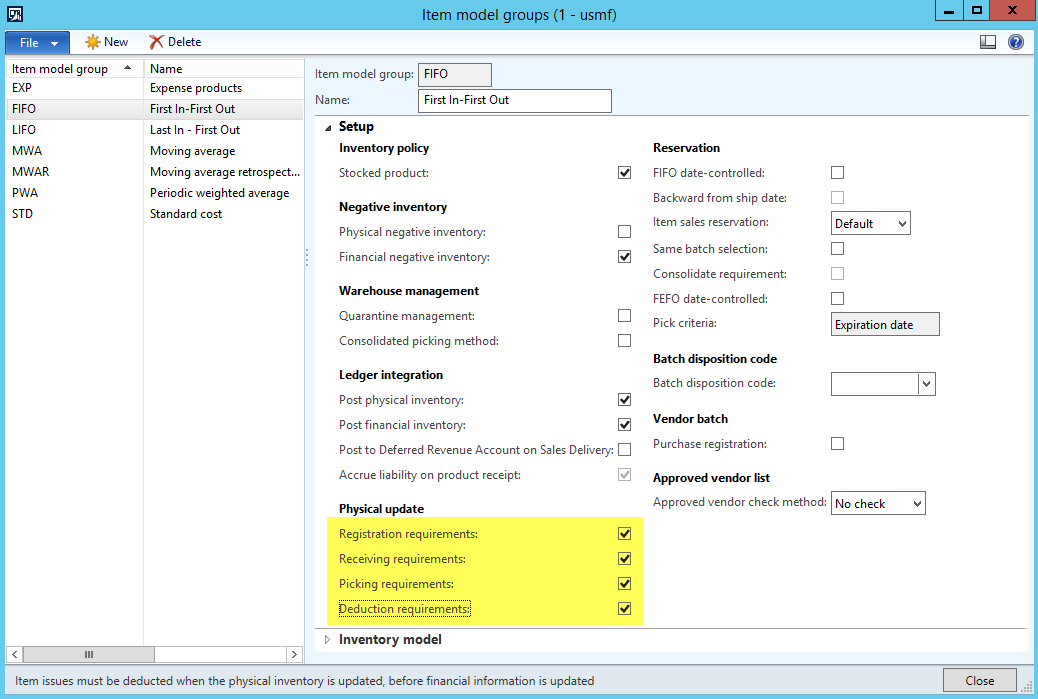 Please note that the setup of registration and receiving requirements in the item model group window do not ensure that you will see negative physical and/or financial inventory values. That is because items can be sold as soon as they are registered in the system.