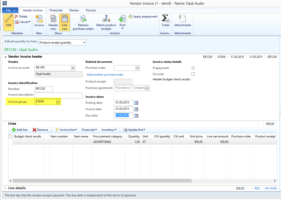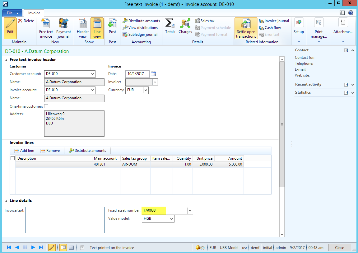 On 01 October a fixed asset („FA0038“) with a net book value of 57000 EUR is sold for 5000 EUR. The asset is sold via the free text invoice as illustrated in the next screenshot. Taxes are disregarded for simplicity.