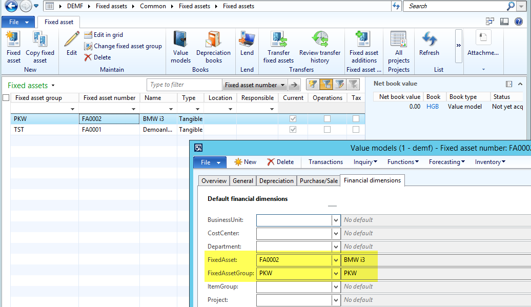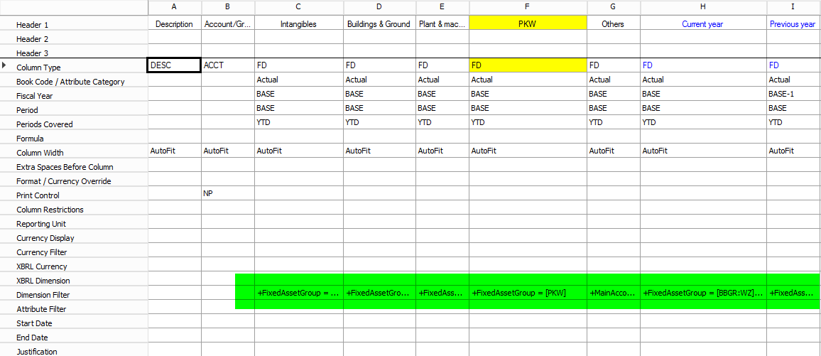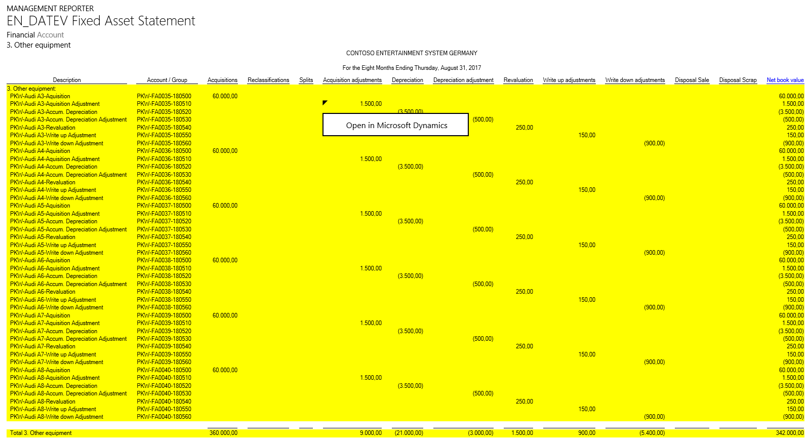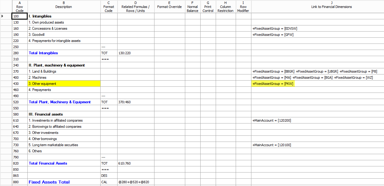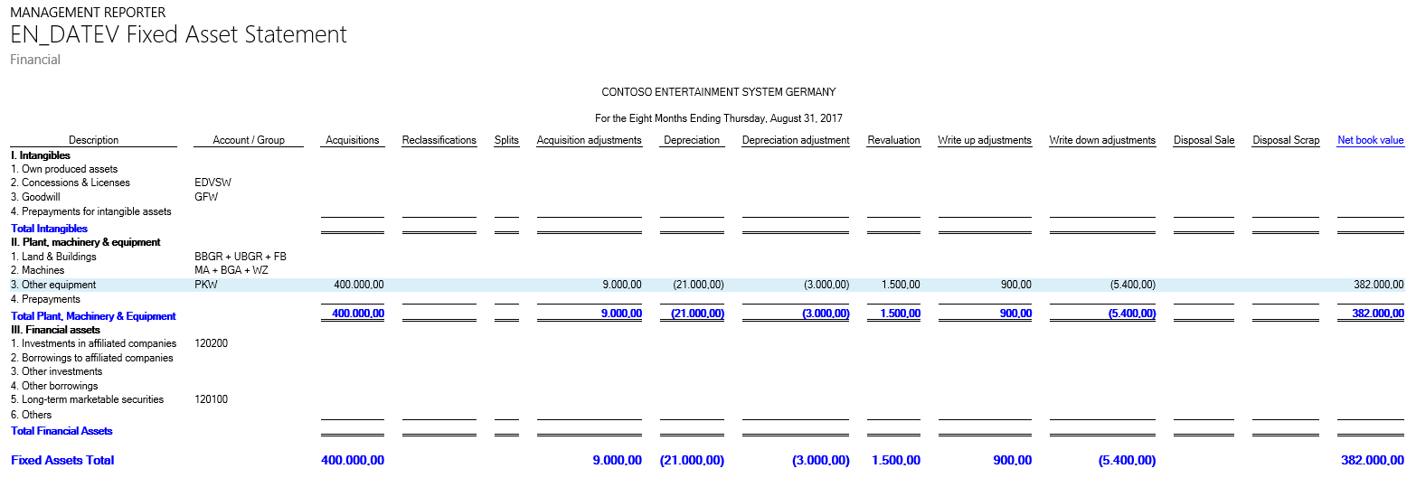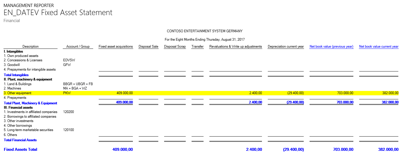 What you can identify from the previous screenshot is that the fixed asset group financial dimension values, (e.g. “PKW”, “MA”, etc.), have been mapped to the different rows of the fixed asset statement report. In addition, two main accounts are included in the report and mapped to the rows in the financial asset section.