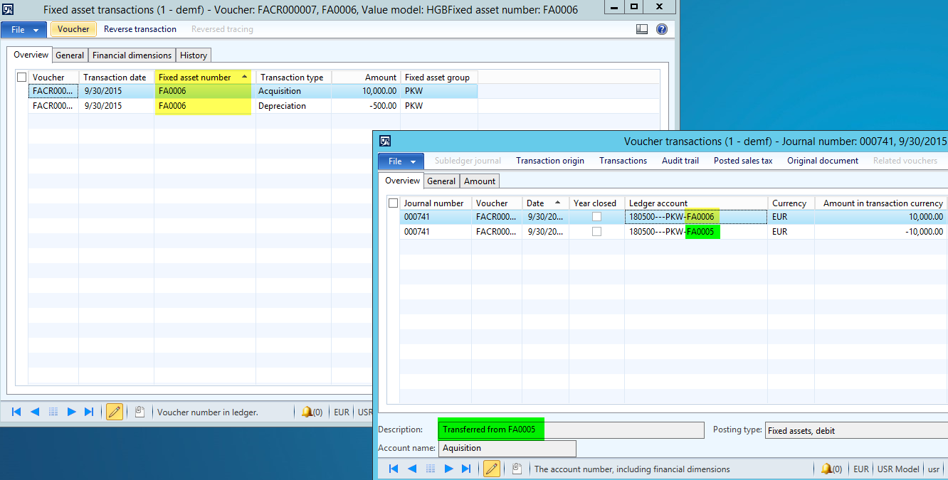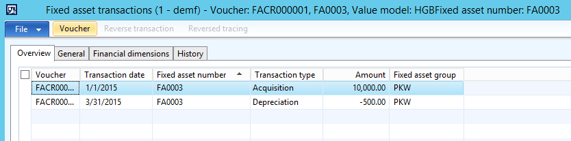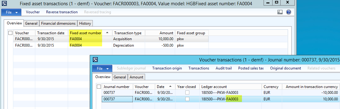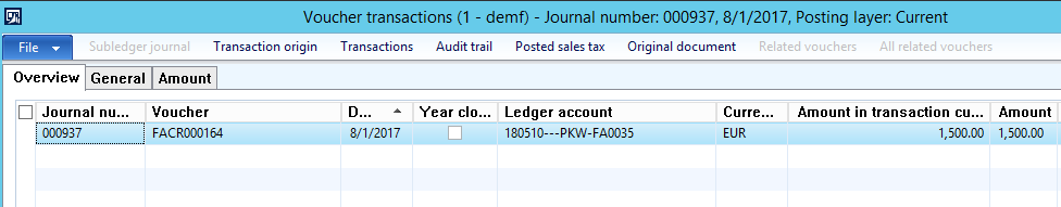 By clicking on the data reported in the fixed asset statement report, users can execute a drill-down into the data that make up the total amounts reported. If this drill-down does not provide sufficient details, the respective Dynamics AX voucher can be opened as illustrated in the next screenshots.