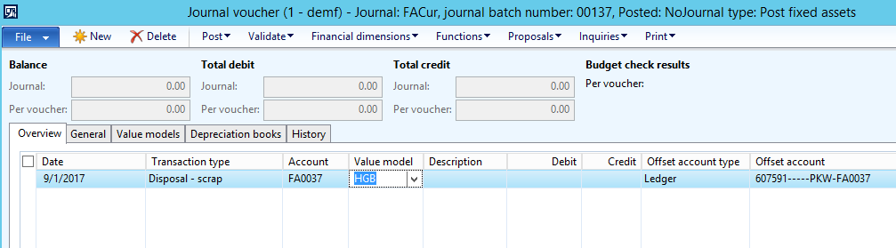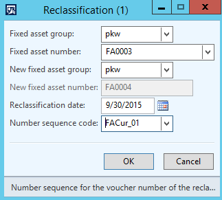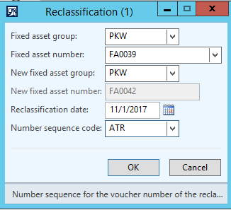 The next special transaction is the reclassification of a fixed asset (“FA0039”) into a new fixed asset (“FA0042”) that Dynamics AX automatically creates.