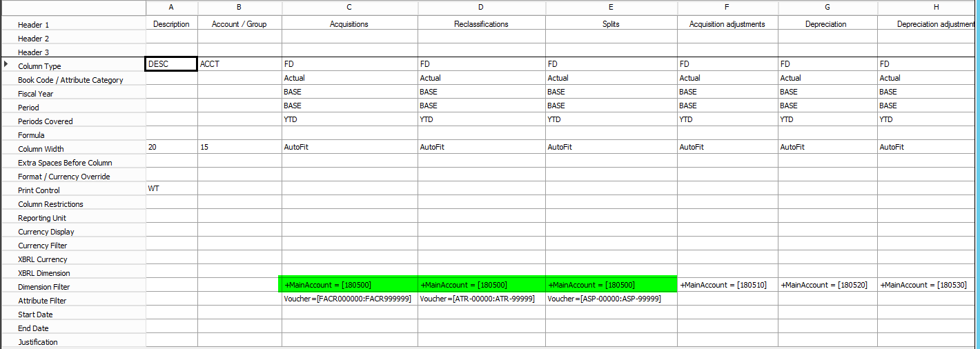 Note: In order to separate fixed asset reclassifications and fixed asset splits from ordinary fixed asset acquisition transactions, an additional attribute filter has been setup in the column definition of the report.
