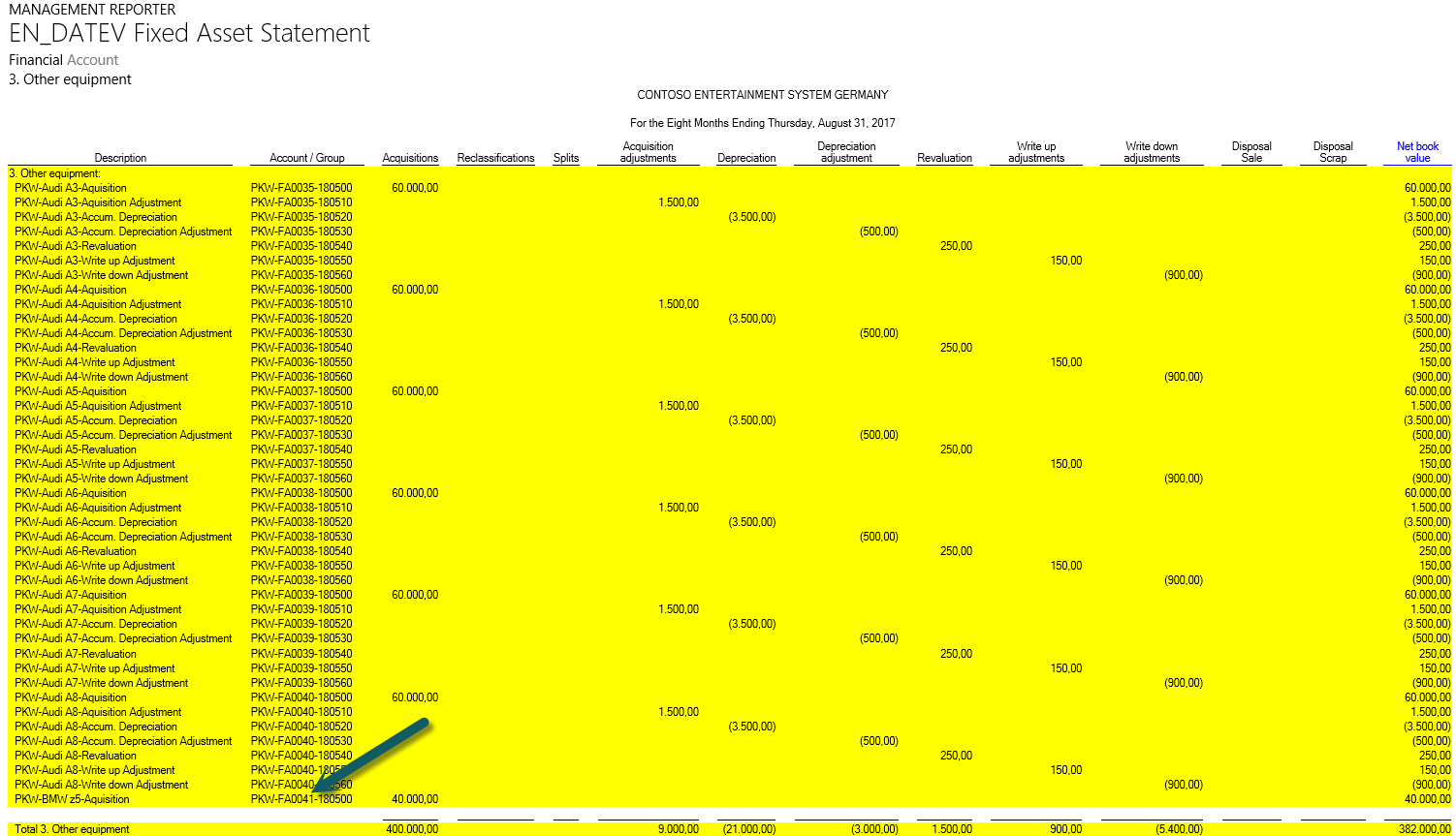 As the fixed asset statement report is mapped to the fixed asset group financial dimensions, newly setup fixed assets are automatically added to the report. To illustrate this, an acquisition transaction for a total of 40000 EUR was recorded for a newly setup fixed asset (“FA0041”). After re-generating the fixed asset statement report, the following result could be identified: