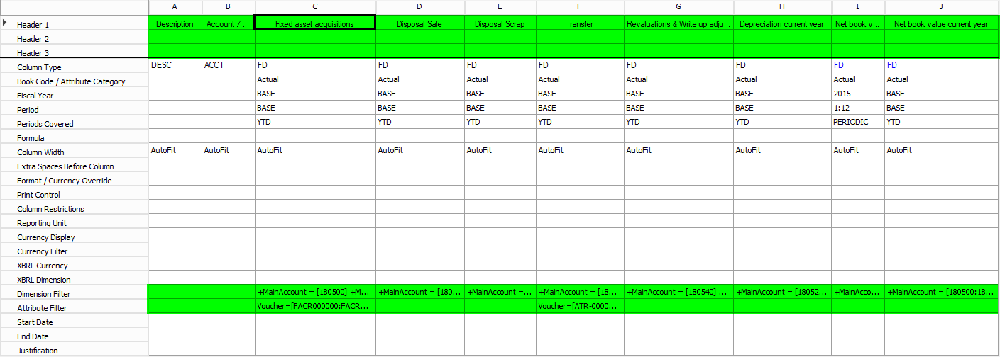 After setting up the row definition, the column definition of the fixed asset statement report is setup. This setup is realized by adding the different fixed asset transaction types – such as acquisitions, depreciation, etc. – to separate report columns and by filtering on the main accounts that are setup for the different transaction types. Please see the next screenshot for an example.