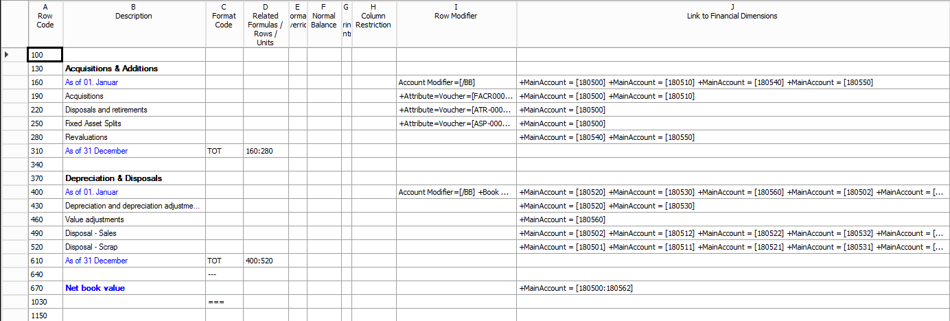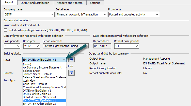 The last remaining issue of the fixed asset statement report – the limitation to one single row structure – can be fixed simply by setting up a new (alternative) row definition that is selected once the fixed asset statement report is generated. The next screenshot provides an example of an alternative Management Reporter row definition.