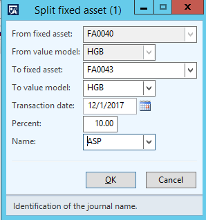The last transaction illustrated here is the split of a fixed asset. In the example used, 10% of the fixed asset value of fixed asset “FA0040” are transferred to another fixed asset “FA0043”.