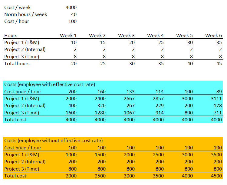 The second column (“P&L statement with indirect costs (cost rate only)”) shows you the effect that can be achieved if you only setup an indirect cost rate but no indirect revenue or invoice rate for example because your customer is not willing to pay for those indirect cost charges.