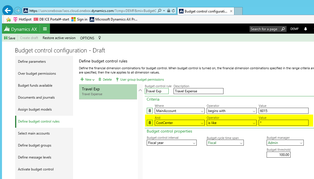 In order to let Dynamics AX check whether or not sufficient budget funds are available when recording travel expense related transactions, I setup the following budget control rule which specifies that all ledger accounts that start with 6015 are subject to budget control. (Please note that these are the travel expense accounts that I showed at the beginning of this post).