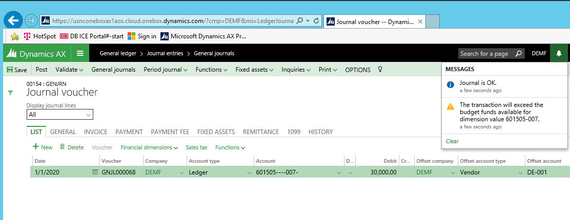 As the total amount recorded exceeds the amount budgeted for the cost center, Dynamics AX gives me a warning message but still allows me posting this journal. The underlying reason for this behavior is the budget group control setup, which compares the amount recorded (30000 EUR) to the total amount budgeted for all travel expense accounts that start with 6015 (60000 EUR).