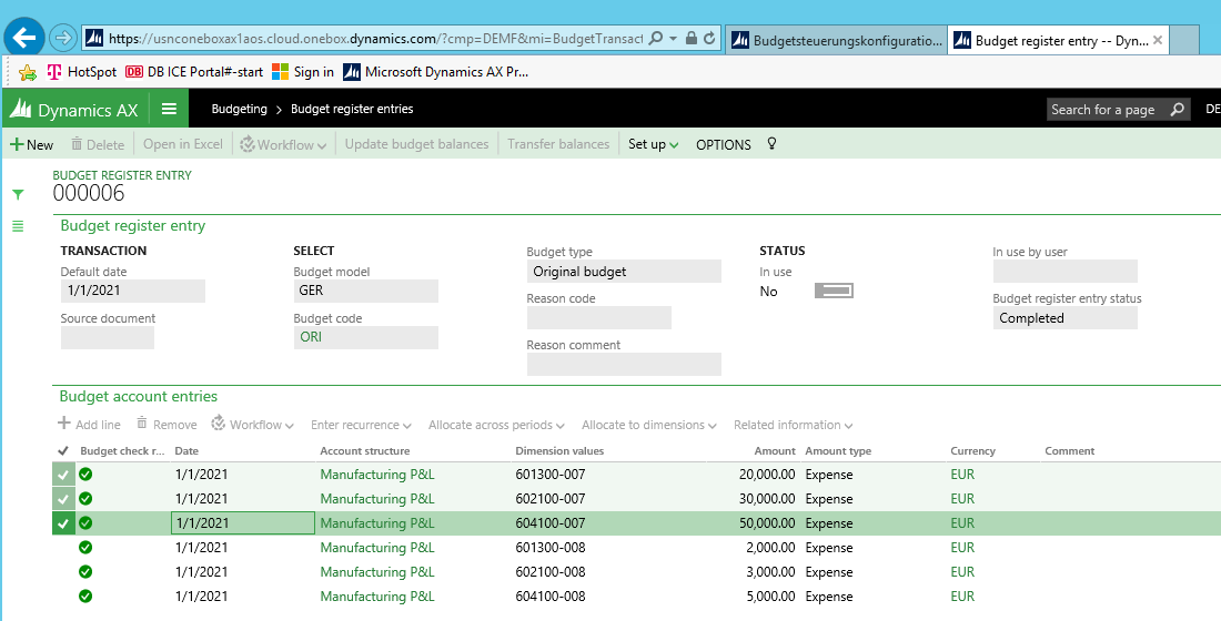 In this third scenario I changed my budget control setup once again to illustrate how budget control can be executed at the financial dimension level. For this illustration I recorded the following six budget register entries for my cost centers 007 and 008. Please see the next screen-print.
