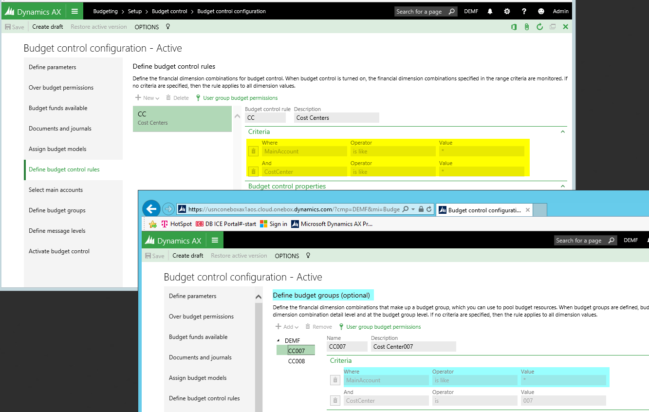 Change 1: I setup a user group (“IN”) that includes my Dynamics AX user and did not allow this user to process transactions that exceed the total amount budgeted. At the same time, I specified that Dynamics AX should execute a second budget control check at the budget group level if the first budget check (at the budget control rule level) fails.