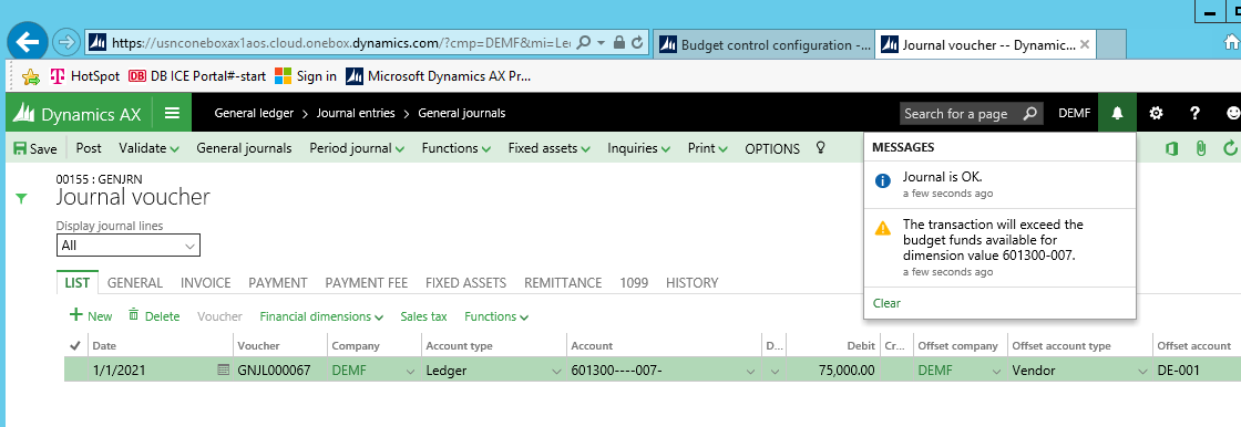 The next screen-print illustrates this behavior by showing that Dynamics AX allows recording a total amount of 75000 EUR even though this amount exceeds the one that has been budgeted for this ledger account-financial dimension combination (20000 EUR). That is because the budget group rule allows recording transactions up to the total amount budgeted for the financial dimension; in my example up to 100000 EUR.