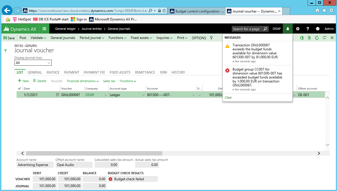 Once the transaction recorded exceeds the total amount budgeted for the financial dimension, Dynamics AX prevents me from processing this transaction. This behavior is illustrated in the next screen-print which shows that a transaction for a total amount of 101000 EUR cannot be recorded as the total amount budgeted for the cost center is less than the amount recorded.