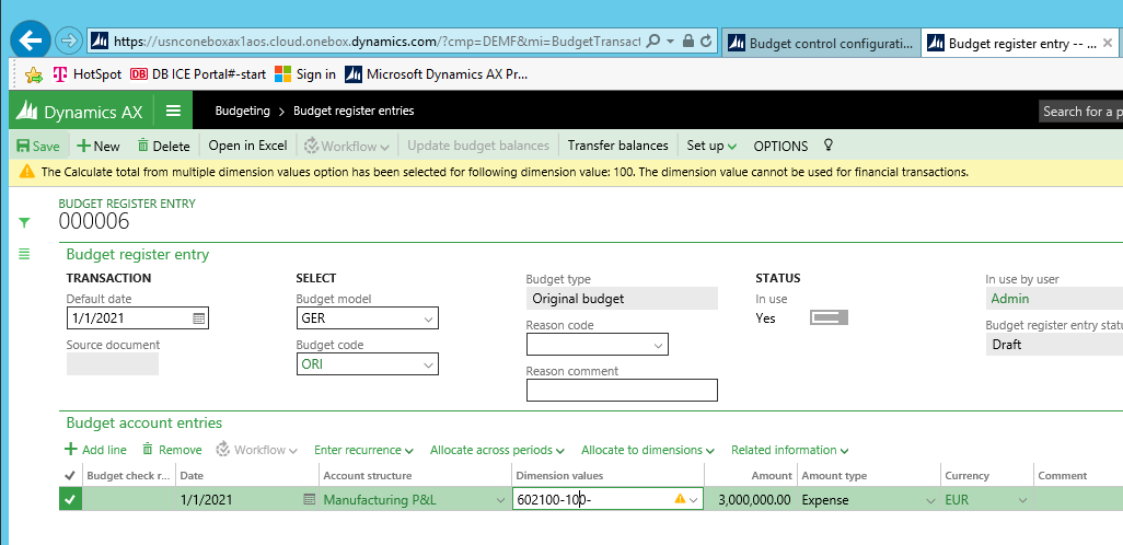 The last hint that I would like to provide here is the fact that Dynamics AX does currently support budgeting for total ledger accounts but not for total financial dimensions. If you try registering a budget for a total financial dimension – such as department 100 in my example illustrated in the next screen-print – Dynamics AX will prevent you from updating and completing this budget register entry.