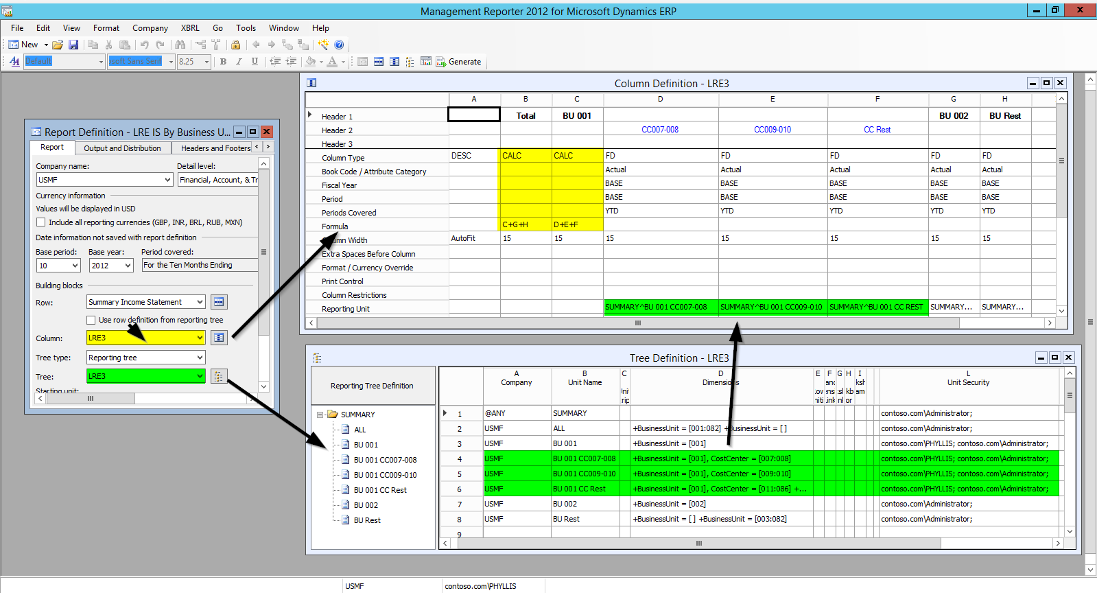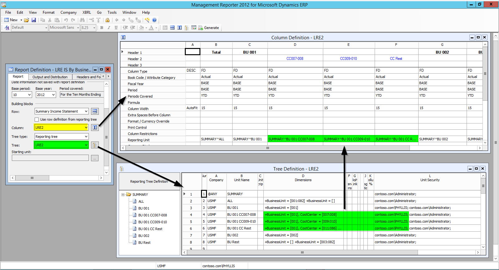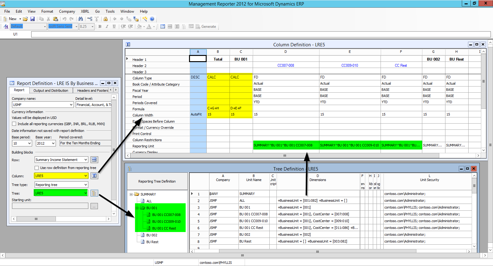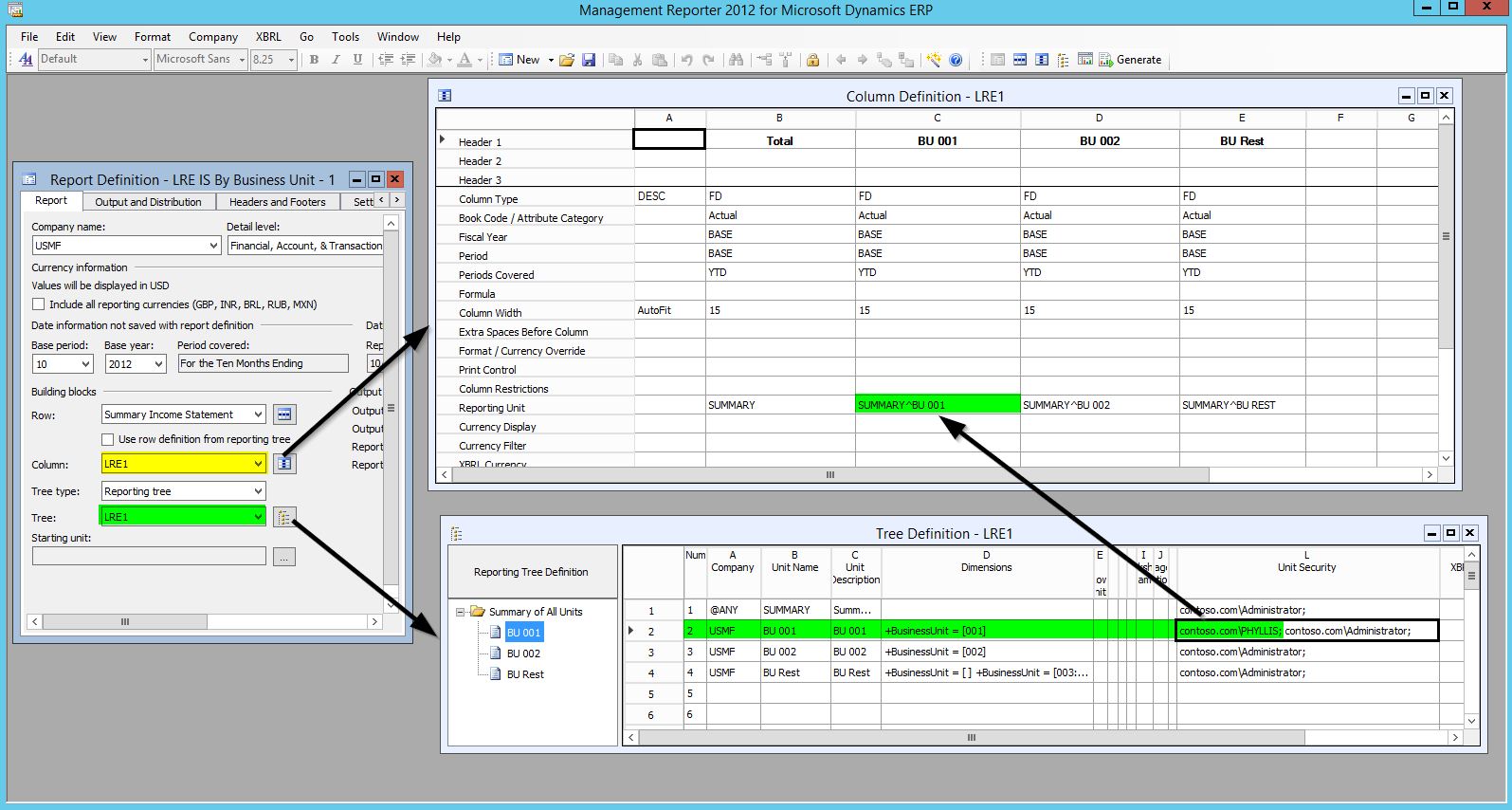Assume that we want to restrict the report data access for Phyllis, the manager of business unit BU001, in a way that she has Access to the Income Statement data of her business unit only. This restriction can be accomplished by setting up a report with a reporting tree that includes the respective users in the unit security column. Because the report includes all business units next to each other in separate columns, the reporting tree elements need additionally to be linked to the respective columns. This is linkage and the unit security setup is illustrated in the next screen-print.