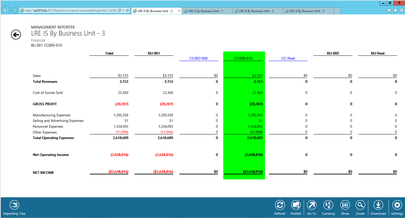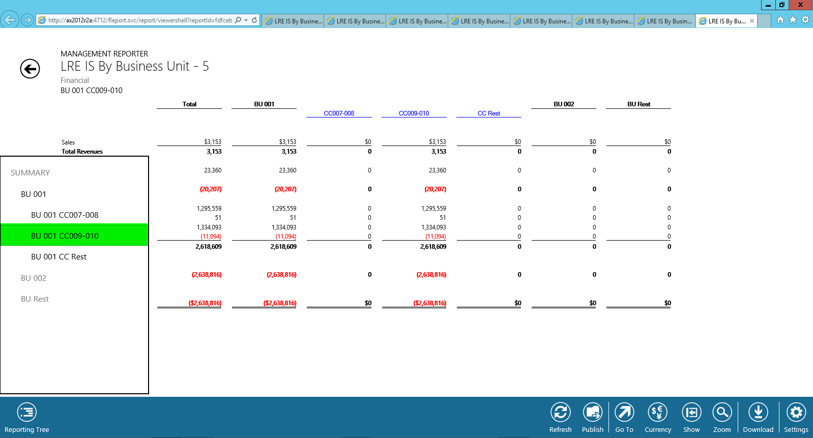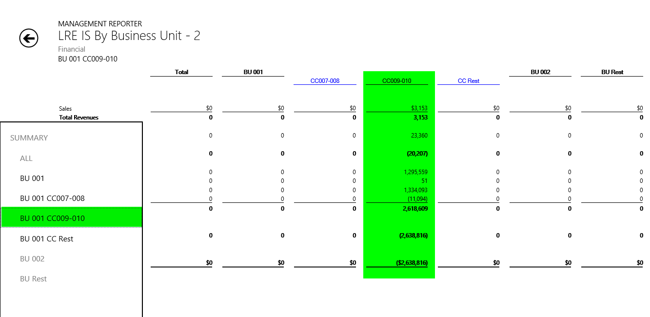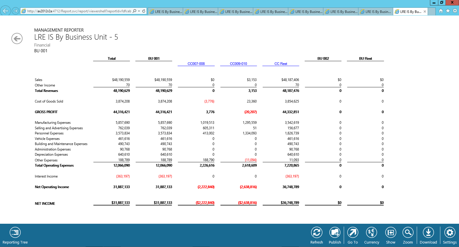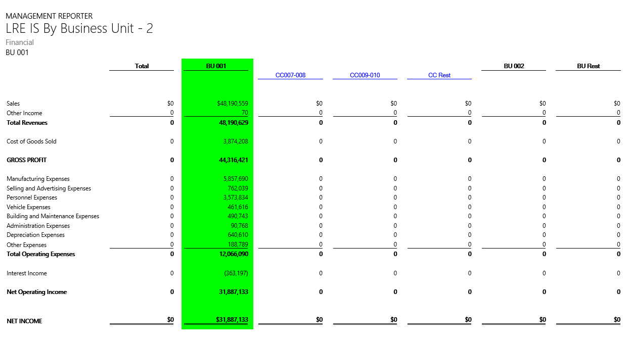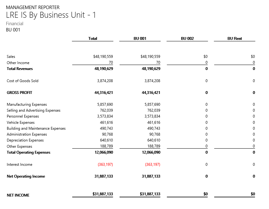 Let’s have a look at the following Income Statement report that shows the total amounts split up by business units to see how the Management Reporter unit security feature can be applied.