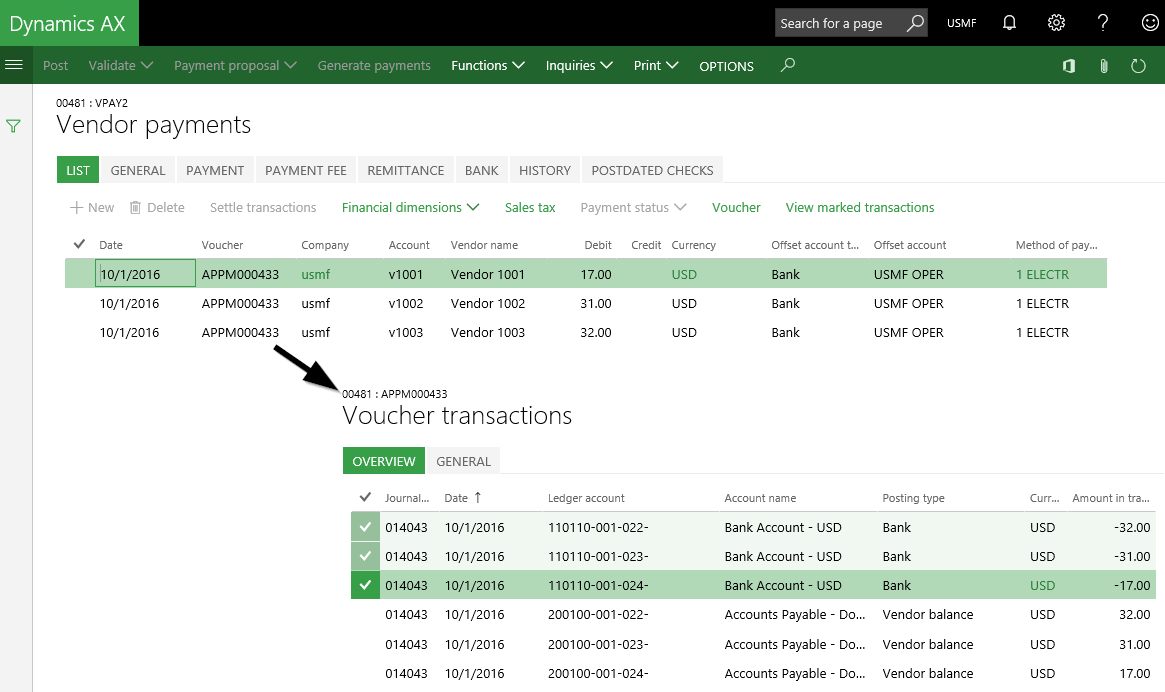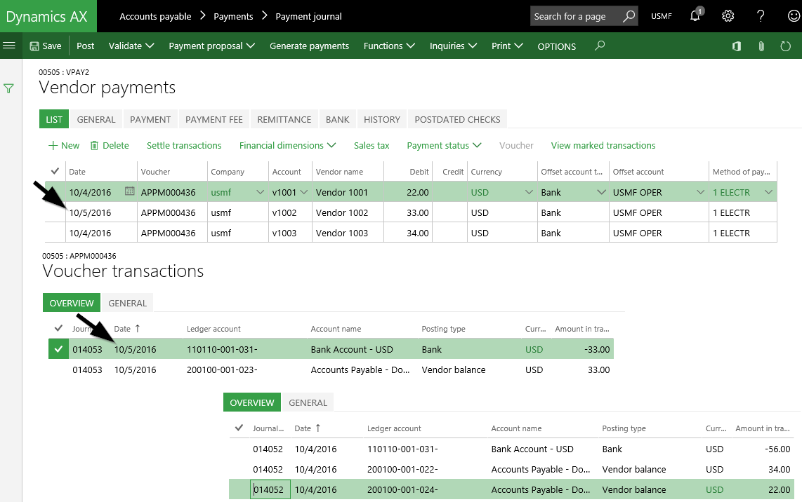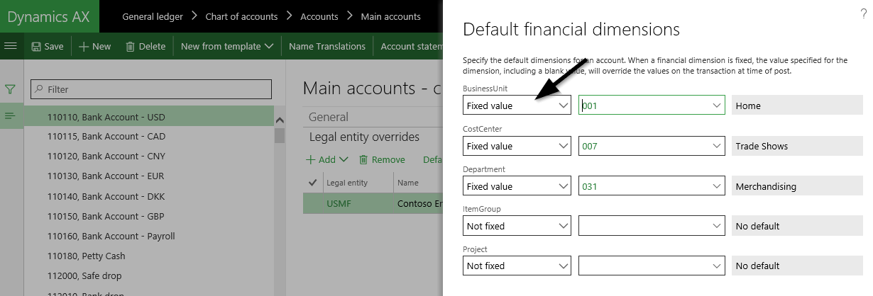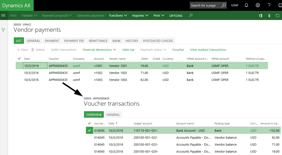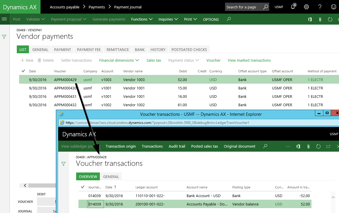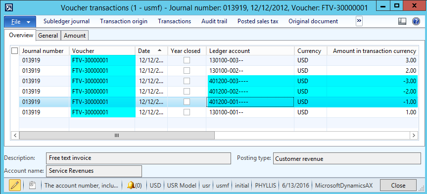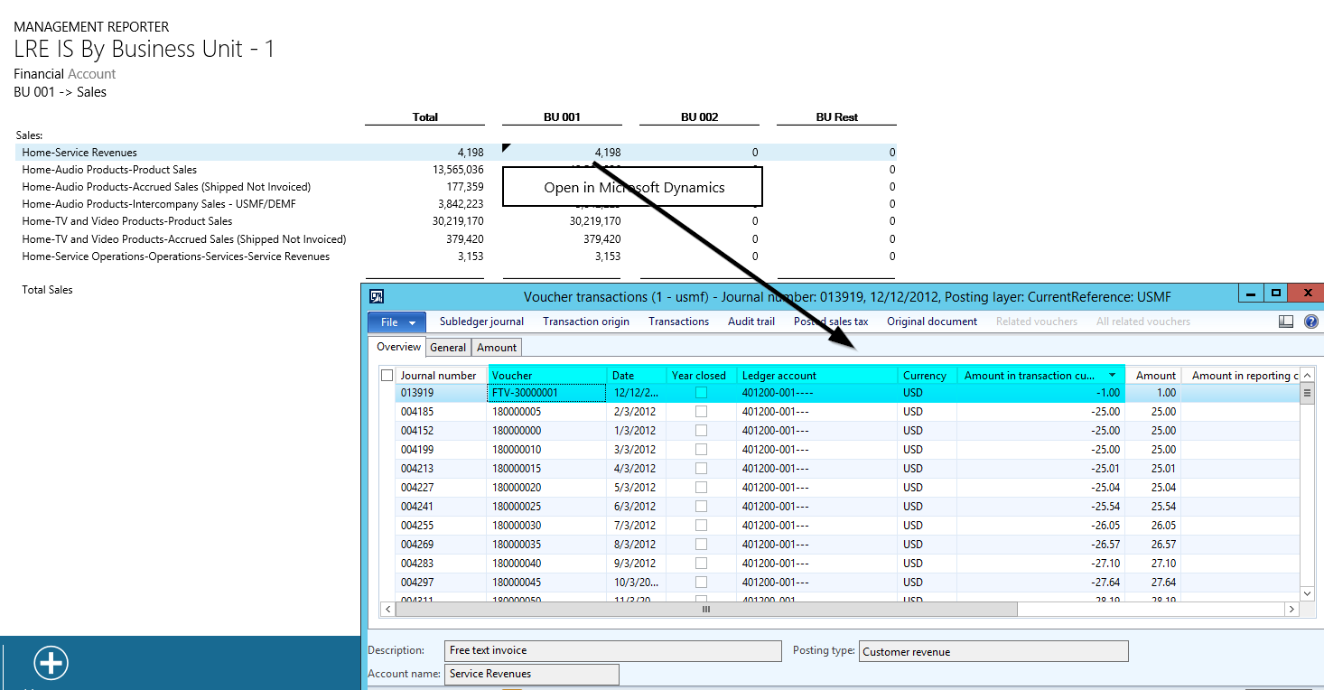 A second thing to note here is that the Management Reporter unit restriction does not control whether or not Phyllis can open and access all transaction details through the Dynamics AX client directly. In the example used Phyllis can, for example, log into the Dynamics AX client and access the complete voucher details including the amounts that were recorded for the other business units. Example: