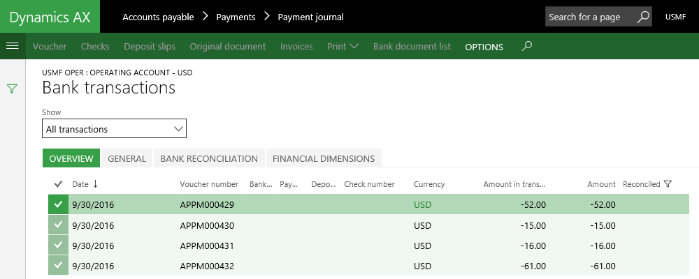 The security restriction setup does also apply to the Management Reporter drill down functionality in Dynamics AX. That is, if Phyllis wants to see the voucher transaction details that make up a specific amount shown in the report and drills down into the Dynamics AX voucher transactions, she will only see the filtered transactions for her business unit. This system behavior is illustrated in the next screen-print: