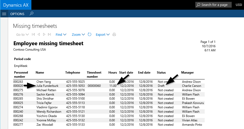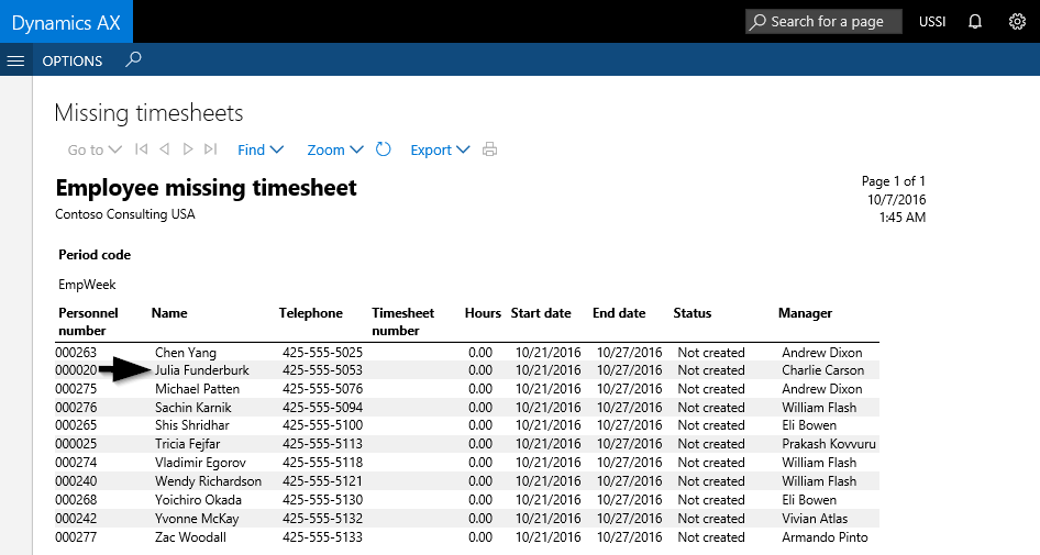 Note: The manager that can be identified in the last column of the missing timesheet report is the one that is specified in the ‘reports to’ field of the employee’s position assignment and can be found in the Human Resource (HR) module.