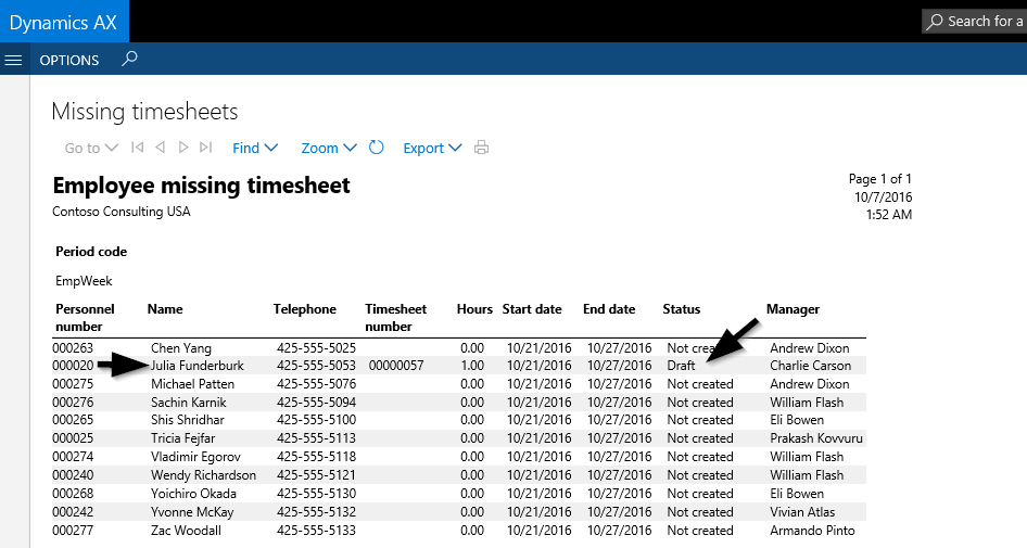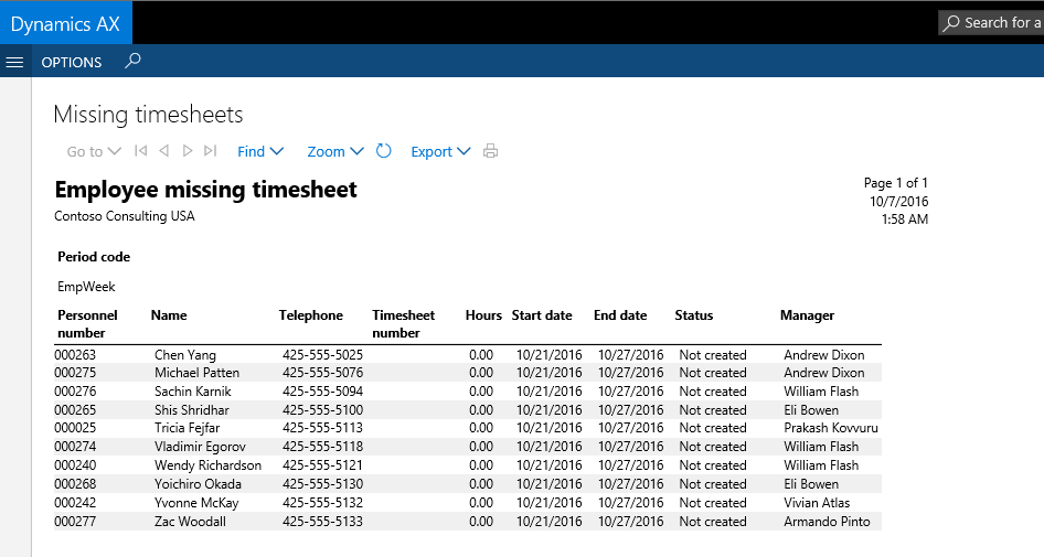 Before invoicing project customers and/or preparing the month-end close, it is a common practice to verify that all employees have recorded their working time. Dynamics AX supports this verification process through the missing timesheet report shown in the next screen-print.